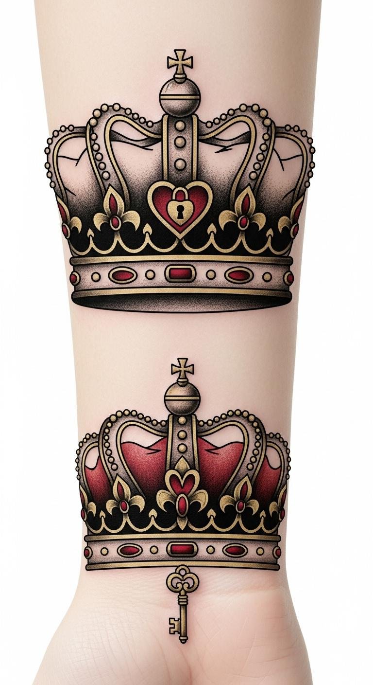 Building on the idea of connection represented by lock and key designs, king and queen crowns take partnership to a regal level. These tattoos embody royal symbolism, celebrating your unique bond and partnership pride.