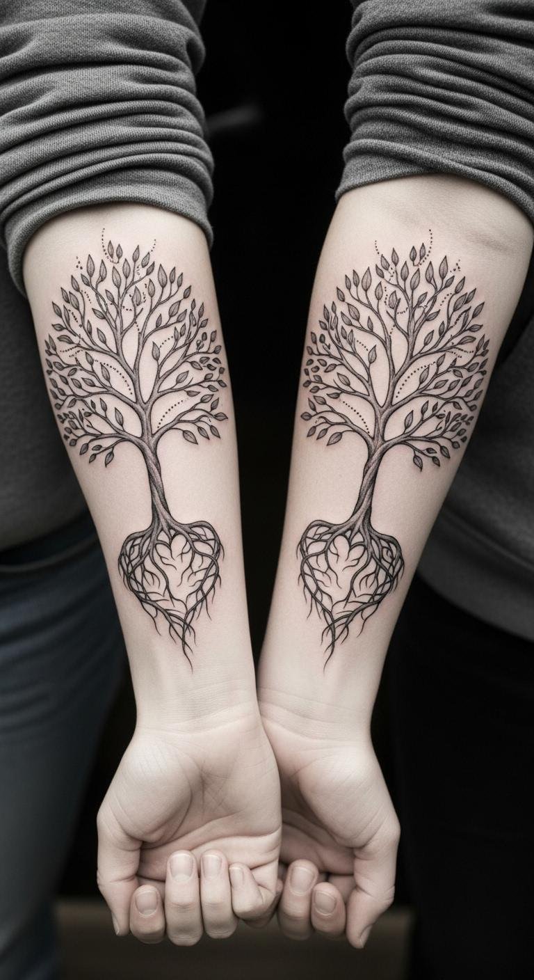 As you explore the beauty of nature-inspired tattoo designs, consider how roots symbolize the deep connections and growth shared between you and your partner.