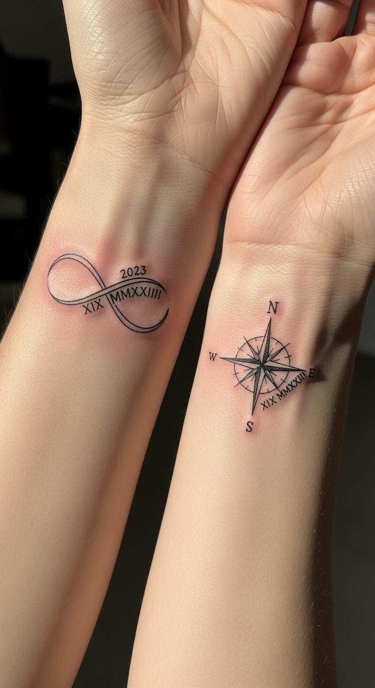 The design pairs an infinity symbol and compass rose united by the couple’s roman numeral date, symbolizing eternal commitment and mutual guidance; fine-line placement on inner wrists offers daily visibility and intimacy, while an alternate ribcage placement provides a private, tender reminder—evoking warmth, permanence, and the shared journey of a relationship.