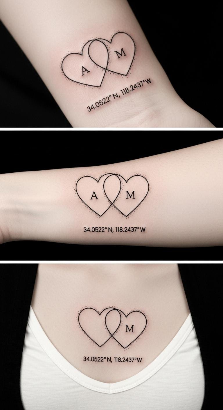 This design combines visible unity (the interlocking hearts) with a private nod (hidden initials and coordinates), evoking intimacy, trust, and shared memory; its fine-line simplicity conveys tenderness while placement options like the wrist or ribcage let wearers choose intimacy versus visibility, and the black ink ensures longevity and emotional weight.