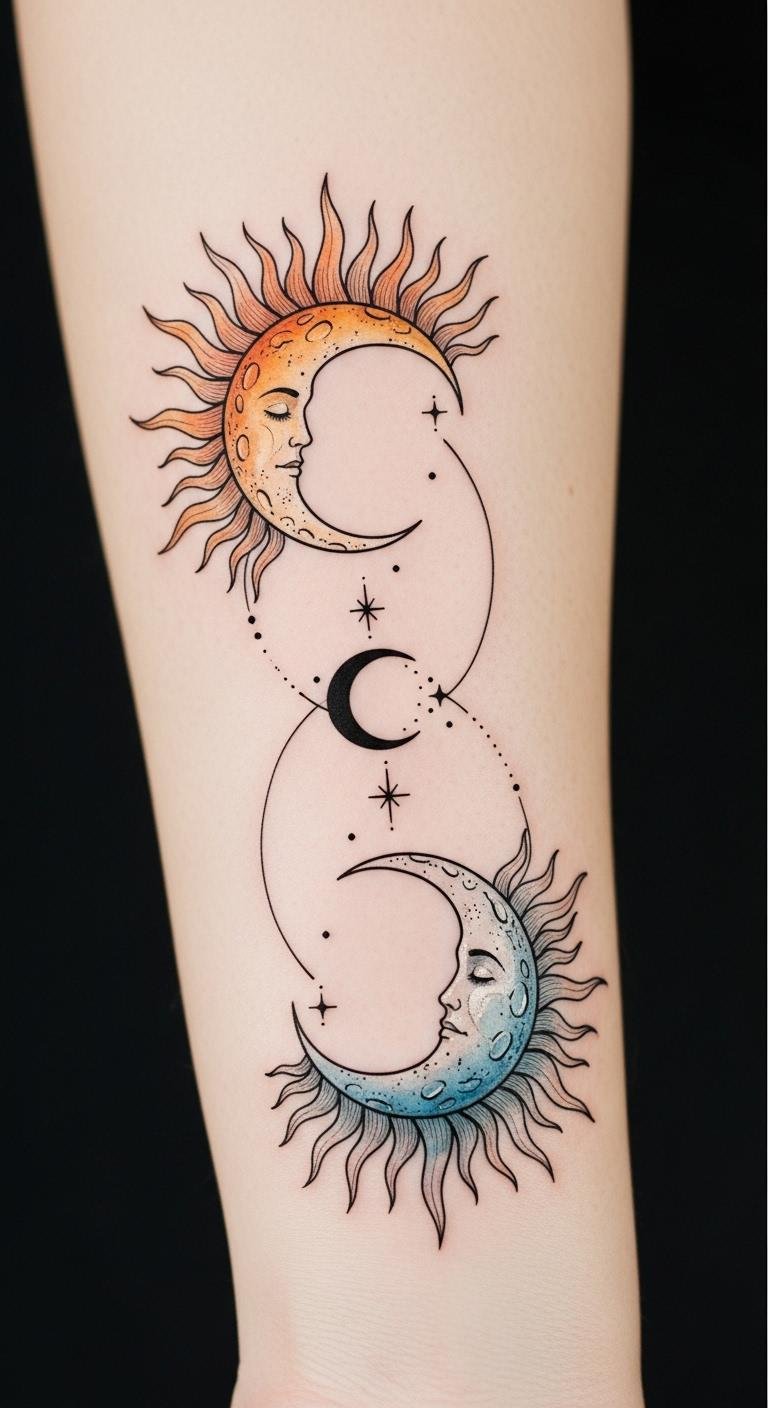 This concept emphasizes complementary duality—the sun’s warmth and energy paired with the moon’s calm and reflection—evoking intimacy, unity, and mutual support; ideal placements are forearm or inner wrist for visibility and daily reminder, or ankle and behind-the-ear for a more private symbol.