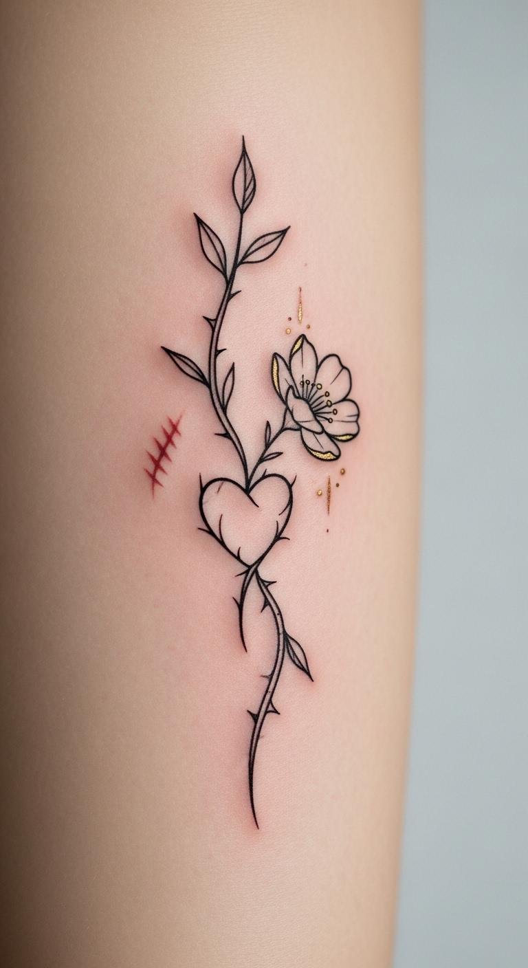 The small heart at the center anchors the piece, showing love as the core that binds the contrasting elements. Emotionally intimate yet understated, the composition suits inner forearm, ribcage, or along the collarbone—places that feel personal and can be revealed selectively, reinforcing trust and the ritual of mutual care.