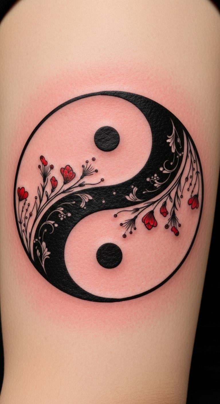 The design places the classic yin-yang at the center, rendered with soft gradients and interlocking botanical motifs—one side with moonlit lilies and cool blue tones, the other with sunlit roses and warm golds—connected by a thin, continuous line that can be split between partners.