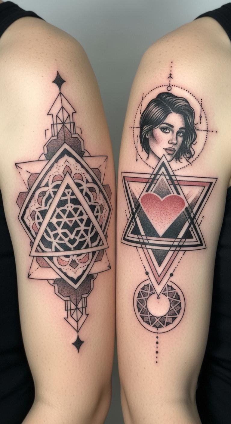 Layer interconnected triangles and concentric circles into a minimal black-line forearm or chest piece, with a small negative-space heart at the intersection and thin dotwork shading radiating outward; use mirrored symmetry for a pair matching across partners. This design symbolizes unity (interconnected triangles), timeless bond (circles), and the shared center (negative-space heart), evoking intimacy, balance, and modern elegance; ideal on inner forearm, chest near the sternum, or behind the collarbone to be personal yet visible.