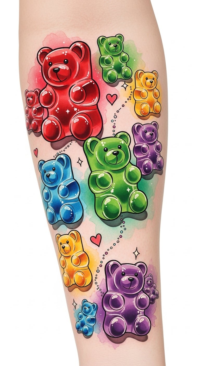 Imagine wearing miniature, glossy gummy bear clusters that symbolize joy, individuality, and playful rebellion; the bright, overlapping hues suggest community and the sweet, tactile memory of childhood while bold outlines give the design modern tattoo clarity. Emotionally, the piece celebrates freedom and lighthearted self-expression, perfect for placement on the forearm or calf where clusters can wrap slightly and catch movement, or scaled down behind the ear or on the wrist as a secret, colorful talisman.