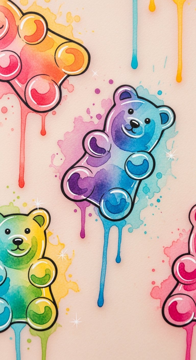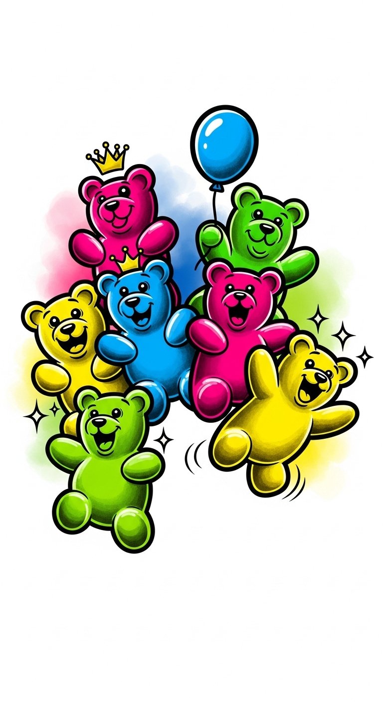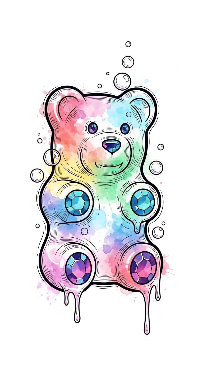 Embrace vibrant watercolor techniques or intricate line work to elevate the playful gummy bear symbolism.