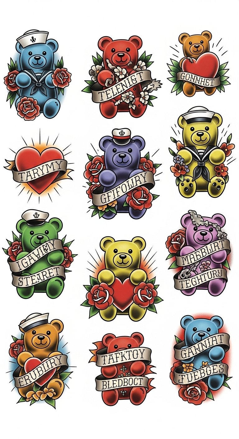 A cluster of candy-bright gummy bears rendered in bold band-flashsheet style—thick black outlines, saturated solid colors, traditional motifs like stars, anchors, roses, banners and subtle stippling—arranged as a playful sleeve or chest piece; include small negative-space highlights and vintage dotwork background to emphasize depth and movement. Symbolically, the gummy bears juxtapose innocence and permanence: childhood joy made enduring through classic tattoo language, evoking nostalgia, levity, and self-acceptance. Emotionally uplifting and rebellious in a gentle way, this design suits forearm, upper arm, shoulder, or across the sternum to celebrate individuality and a carefree spirit.