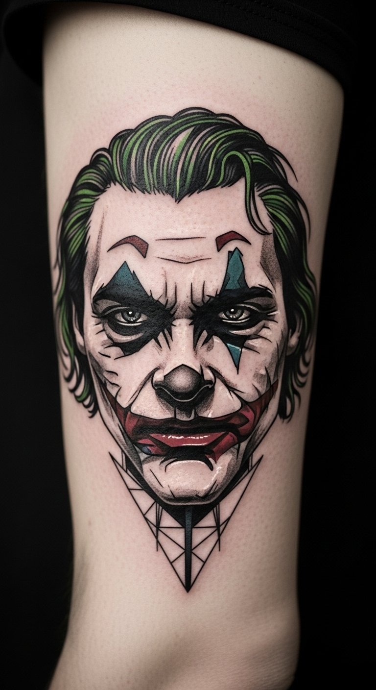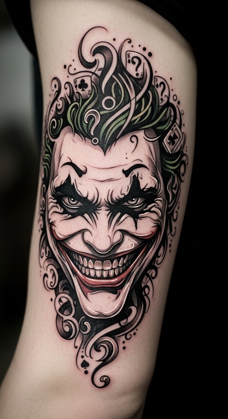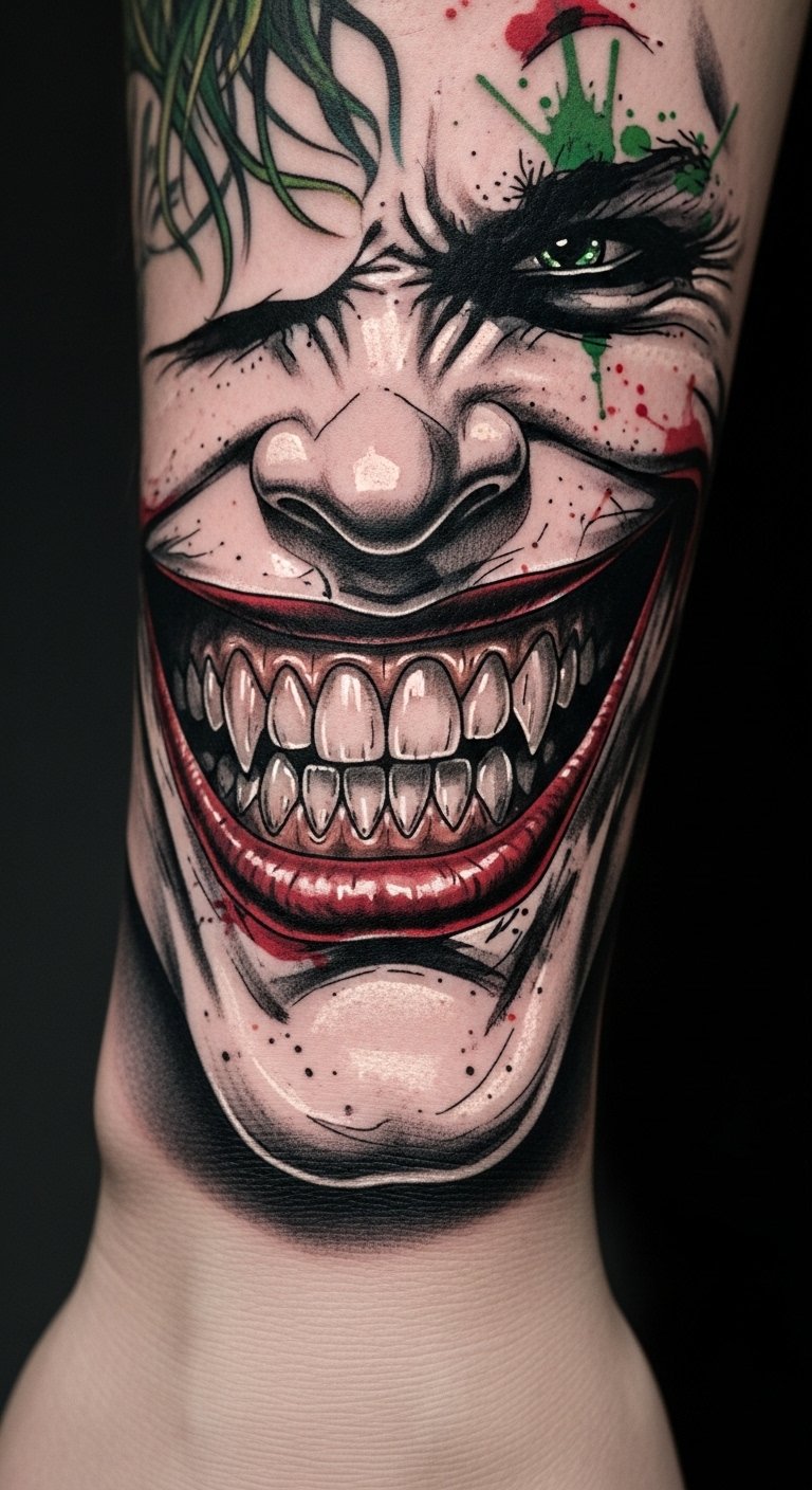 Flowing along the forearm or wrapping the ribcage, this abstract Joker smile uses sweeping curves, jagged accents, and fragmented negative space to symbolize the tension between chaos and control; vibrant splashes of color (neon greens, deep purples, and stark blacks) evoke manic joy and hidden sorrow, while delicate thin-line details suggest personal stories and scars.