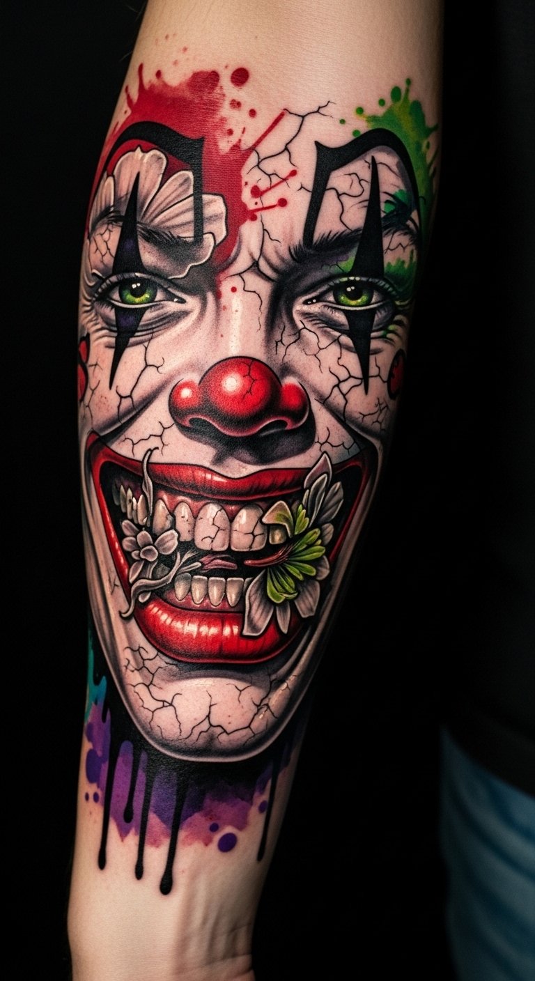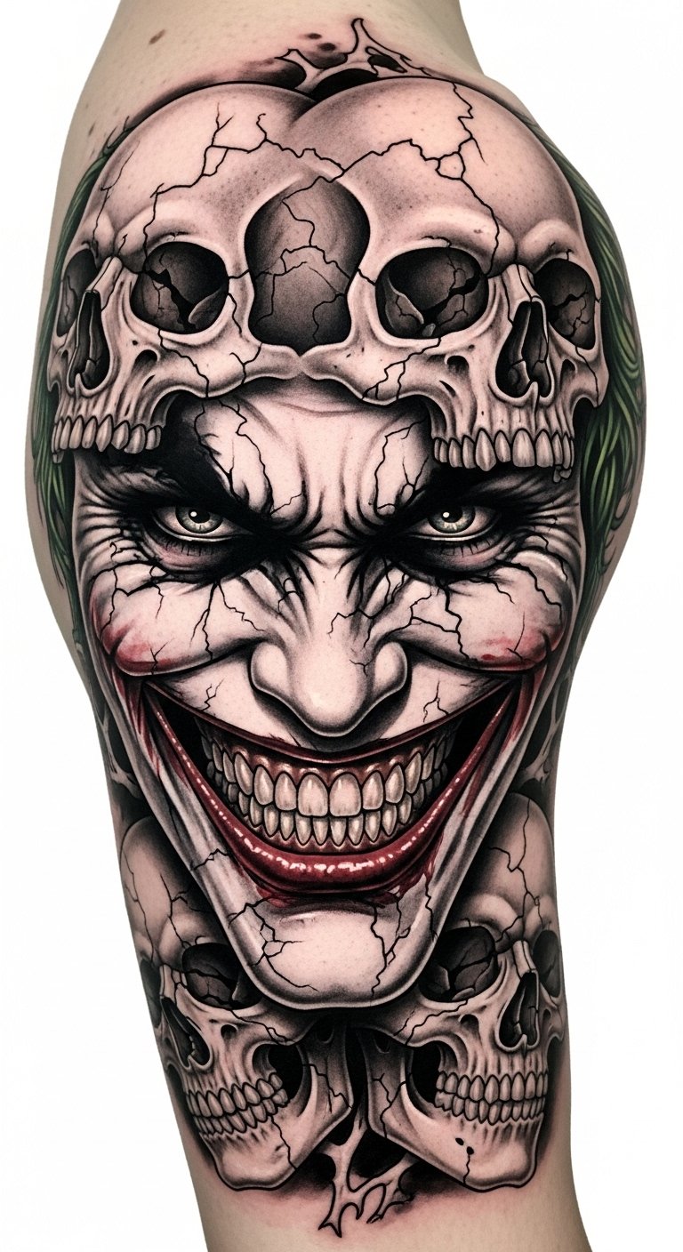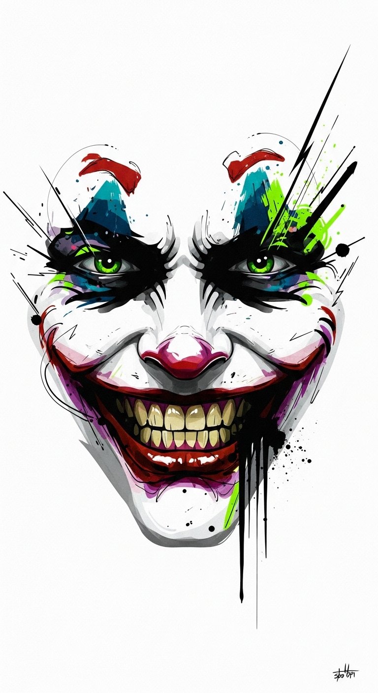 Flowing along the forearm or wrapping the ribcage, this abstract Joker smile uses sweeping curves, jagged accents, and fragmented negative space to symbolize the tension between chaos and control; vibrant splashes of color (neon greens, deep purples, and stark blacks) evoke manic joy and hidden sorrow, while delicate thin-line details suggest personal stories and scars.