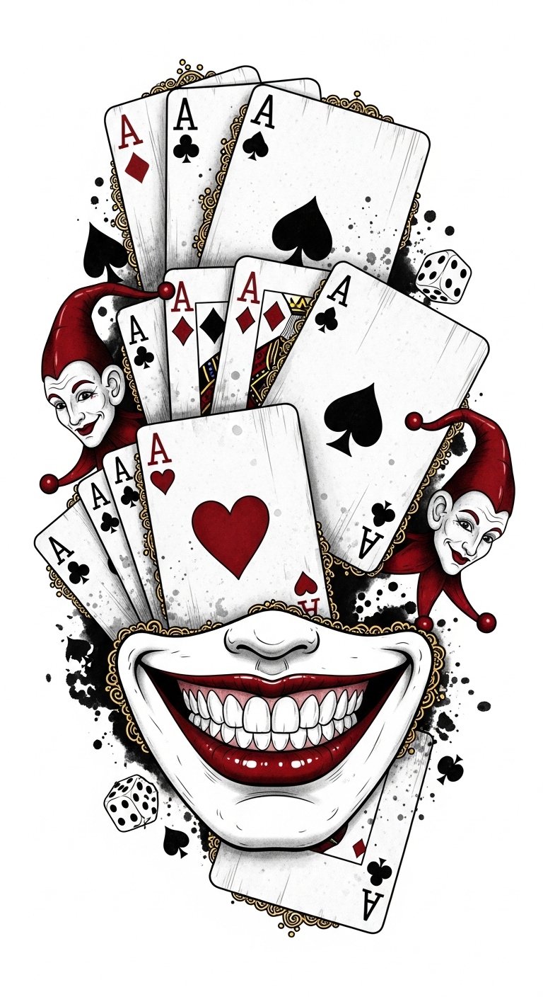 This placement works on the forearm, chest, or upper thigh to allow the curved cards to wrap with musculature; emotionally it channels daring, mischief, and defiant joy, using contrast and distressed card details to suggest a life lived on the edge.