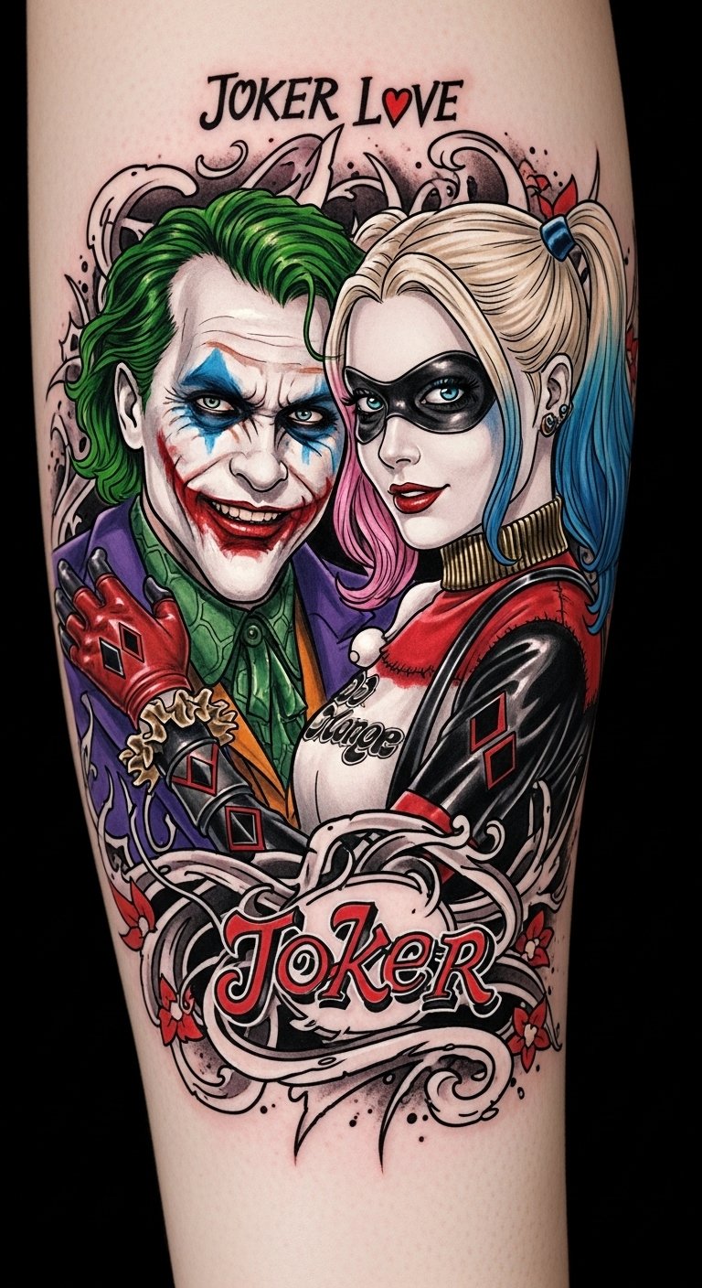 Symbolically this design balances mischief and devotion—Joker’s smile represents the destructive charisma and unpredictability, Harley’s motifs signify playful rebellion and resilience—evoking a tense love that evolved from co-dependency into personal transformation; emotional tone is darkly romantic and anarchic, best placed where it can curve with muscle movement so the imagery shifts as the wearer moves.