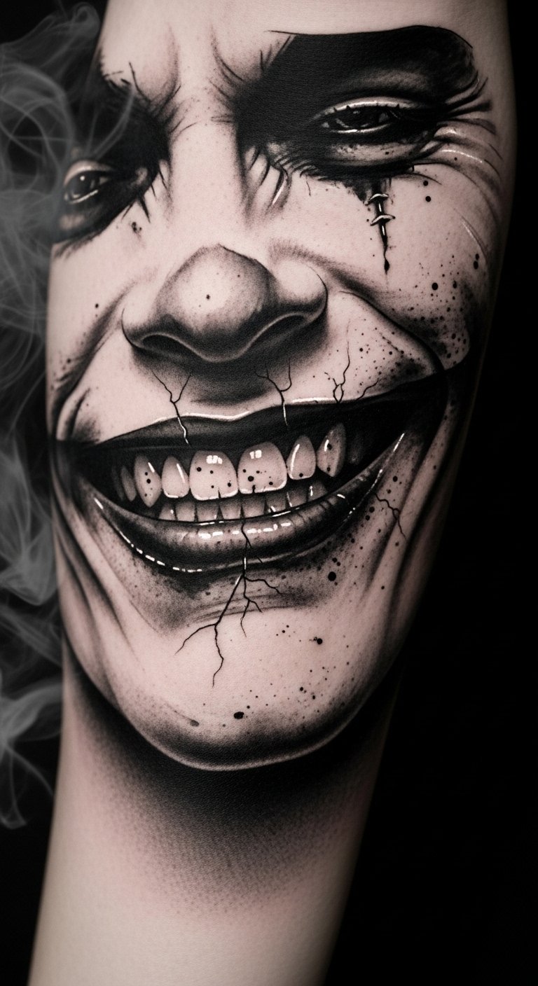 A black and gray Joker smile tattoo captures the essence of duality, where light and shadow intertwine to evoke a spectrum of emotions.