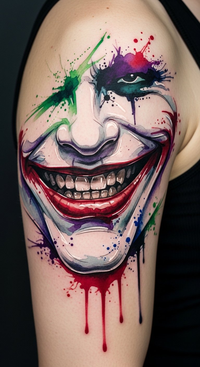 While the traditional Joker smile often leans into bold lines and classic imagery, a watercolor Joker smile tattoo brings a fresh, vibrant twist that captivates the eye.