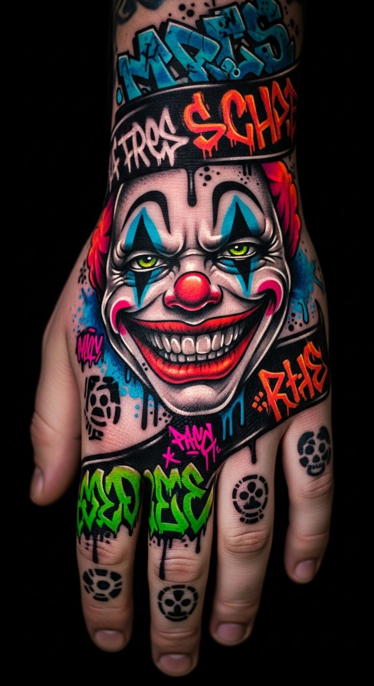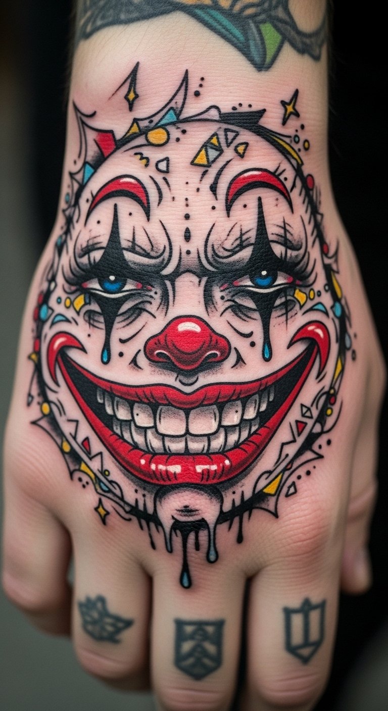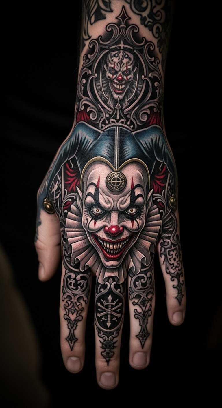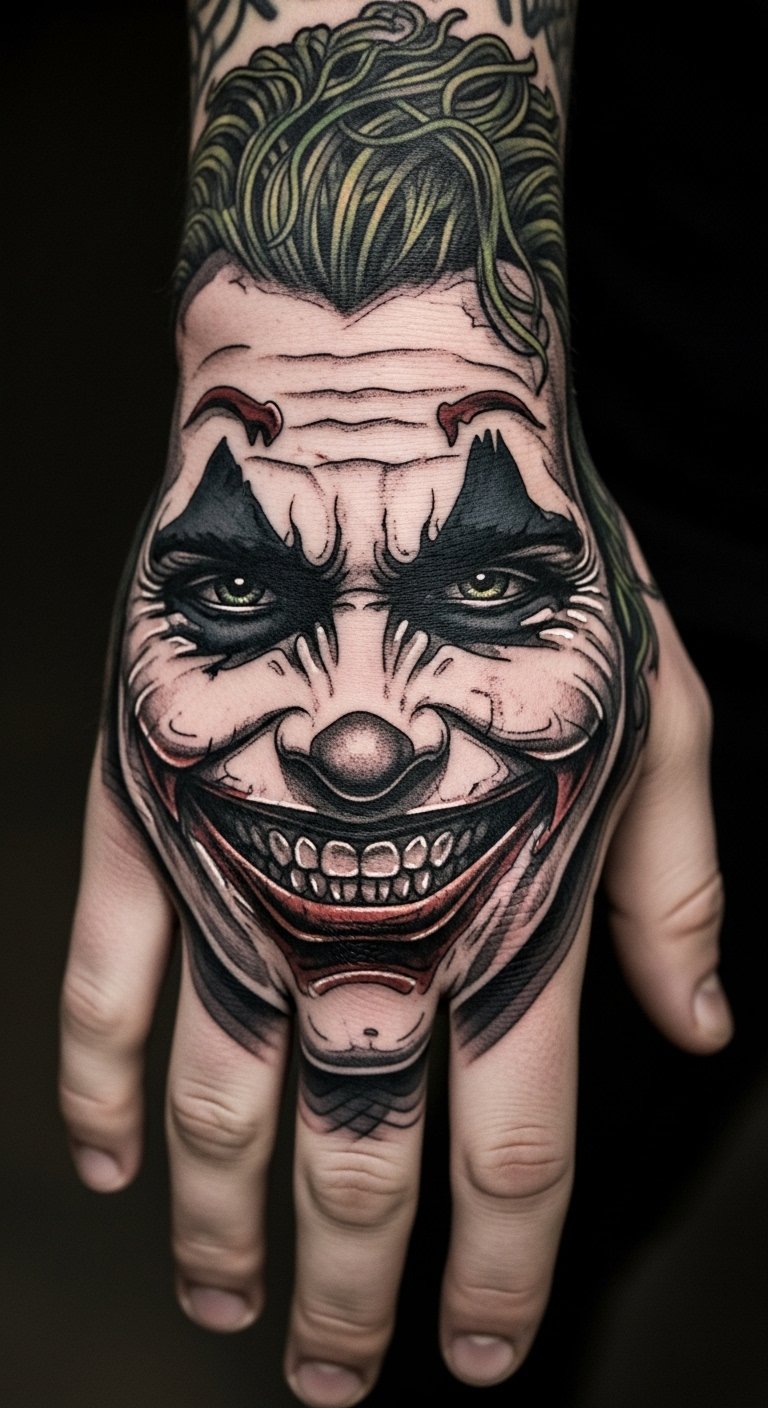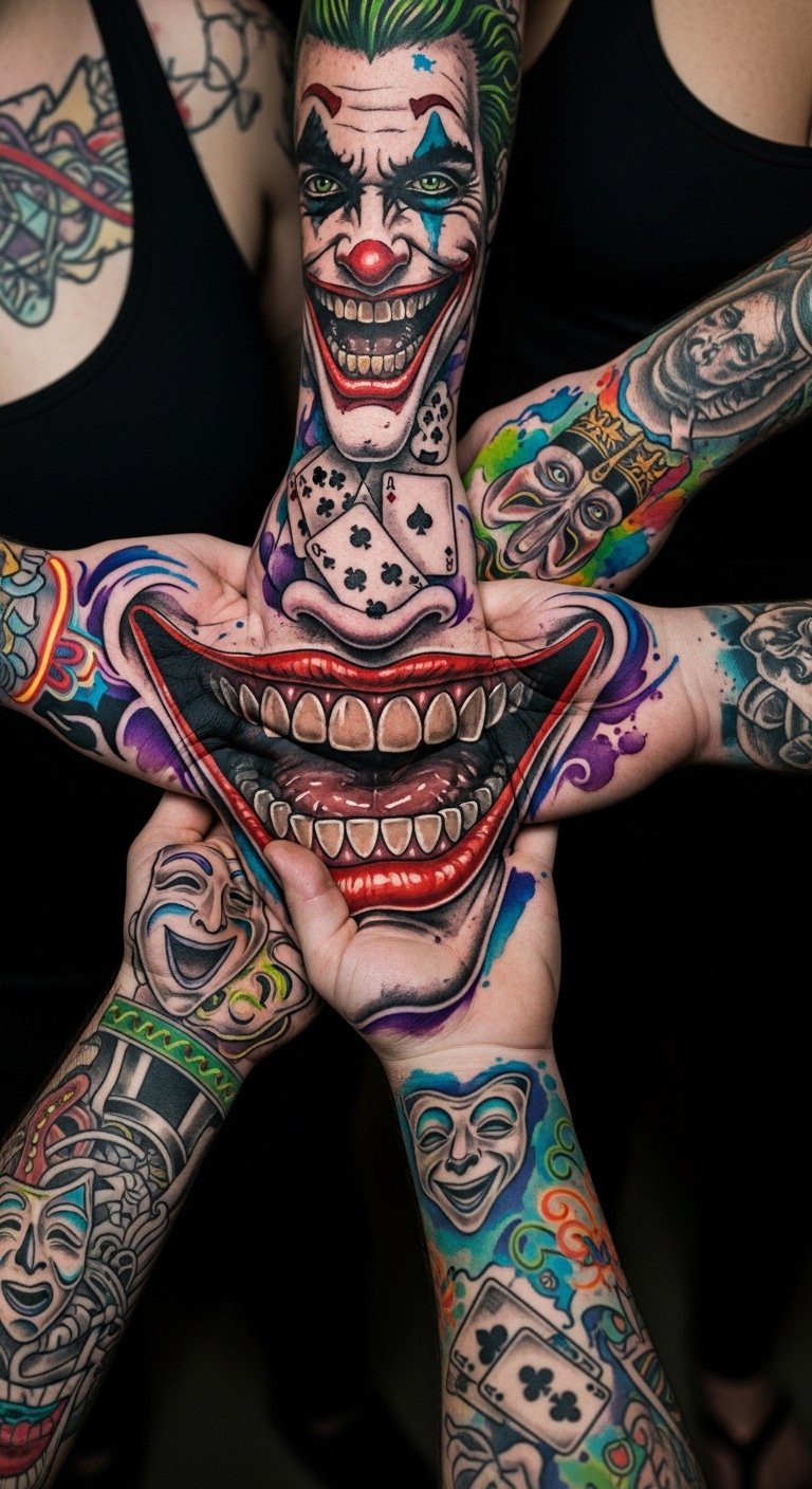 Imagine a tattoo that plays tricks on the eye, where the Joker’s iconic smile transforms into a mesmerizing illusion. This design captivates with its layered meanings, reflecting the joker smile psychology of chaos and unpredictability. It symbolizes freedom from societal norms, inviting curiosity and conversation. Each glance reveals new depths, making your hand a canvas of bold expression and unrestrained individuality. The symbolism embraces duality: humor and menace, control and release—evoking uneasy delight and daring self-expression; emotionally it provokes curiosity, defiance, and empowerment. Ideal placement is the back of the hand or along the forearm where shifting perspectives animate the illusion and conversations naturally start.