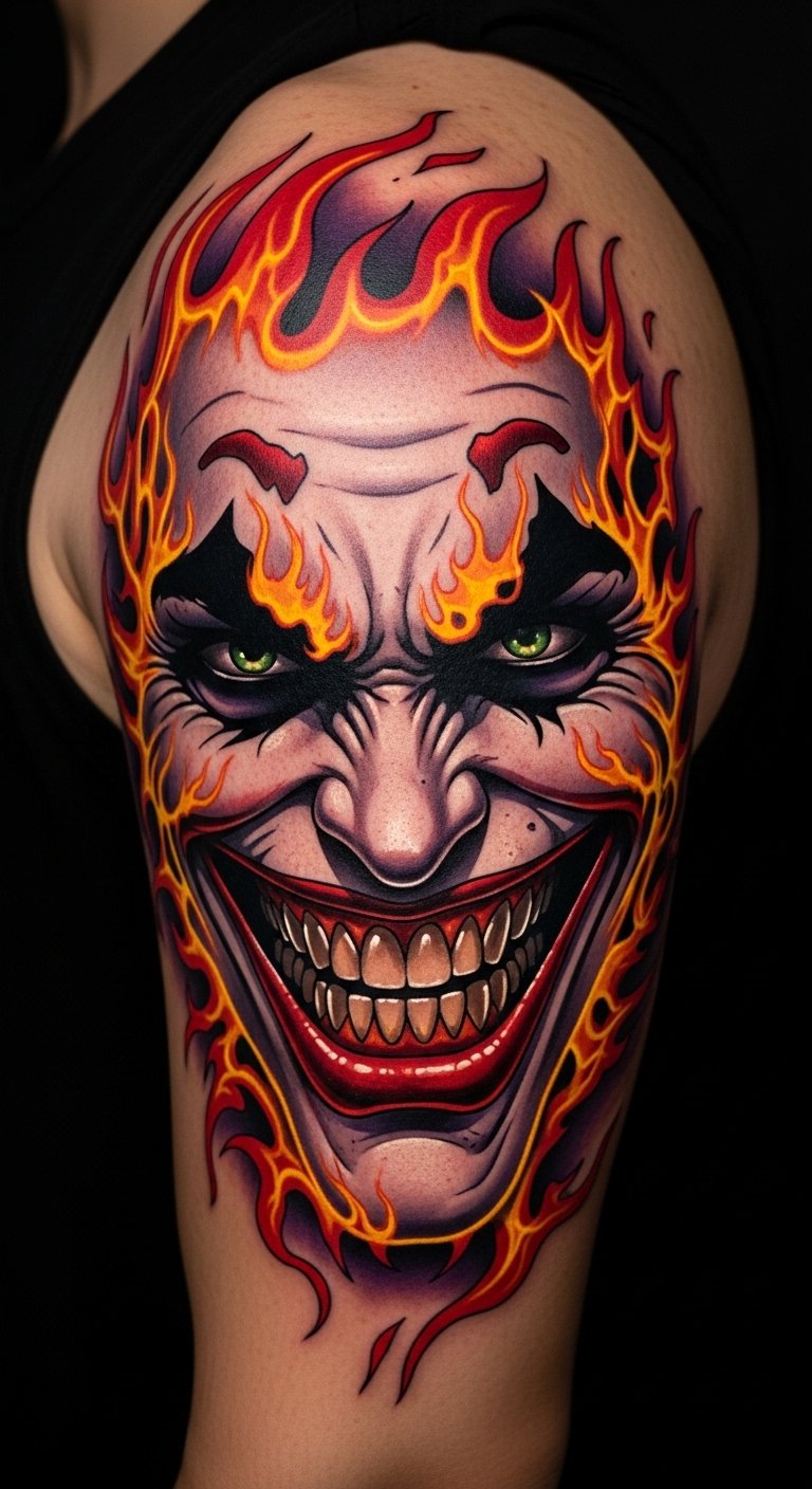 This design symbolizes defiance and raw emotion—flames representing transformation and the Joker smile conveying unpredictable charisma. It evokes fierce confidence and controlled chaos; ideal placements include the forearm, upper arm, chest pocket area, or calf for visibility and movement that makes the flames appear alive.