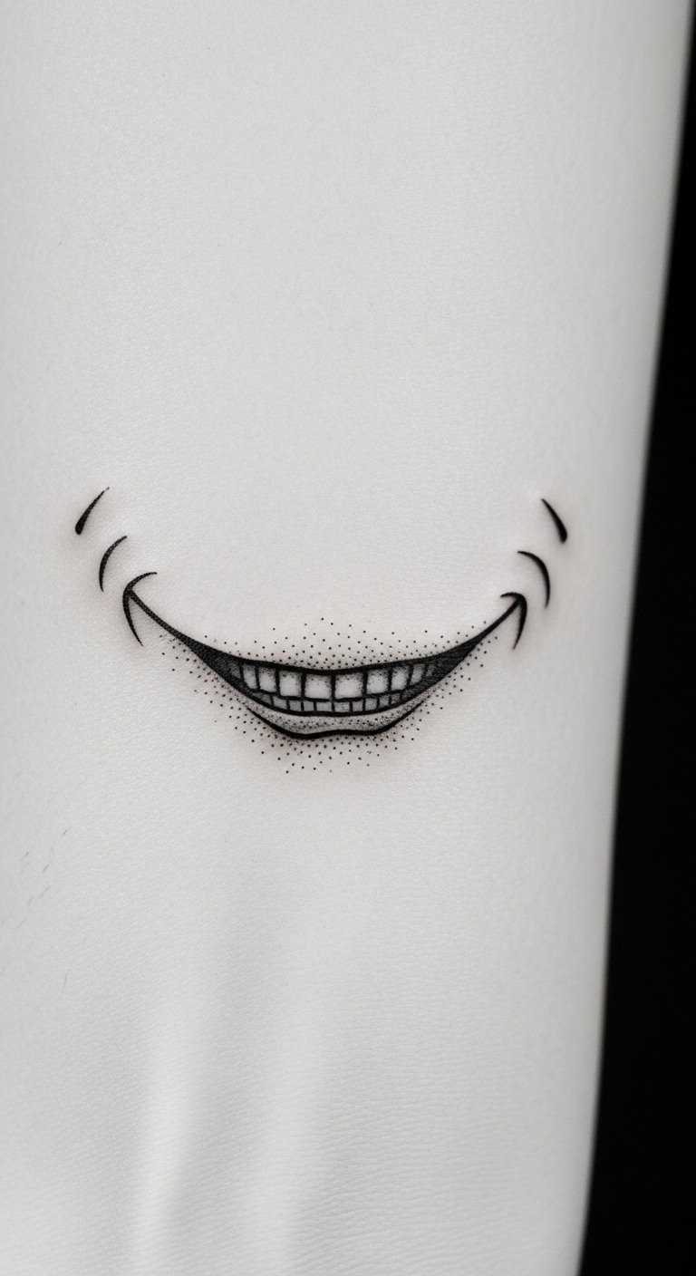 Emotionally it evokes mischievous confidence and unapologetic self-expression; ideal placements include the forearm, shoulder blade, or calf where the arc of the smile can flow with the body’s contours and allow for visible detail and movement.