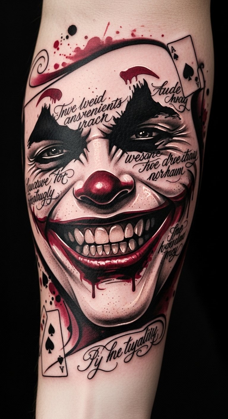 Choose quotes that resonate with your spirit, capturing the essence of rebellion and freedom, making your tattoo a unique, bold statement that speaks volumes. The design combines the menacing joy of the exaggerated grin with textual elements to create tension between image and word: the curved teeth convey chaos, the handwritten quotes provide personal voice, and the playing card motifs hint at mischief and unpredictability.