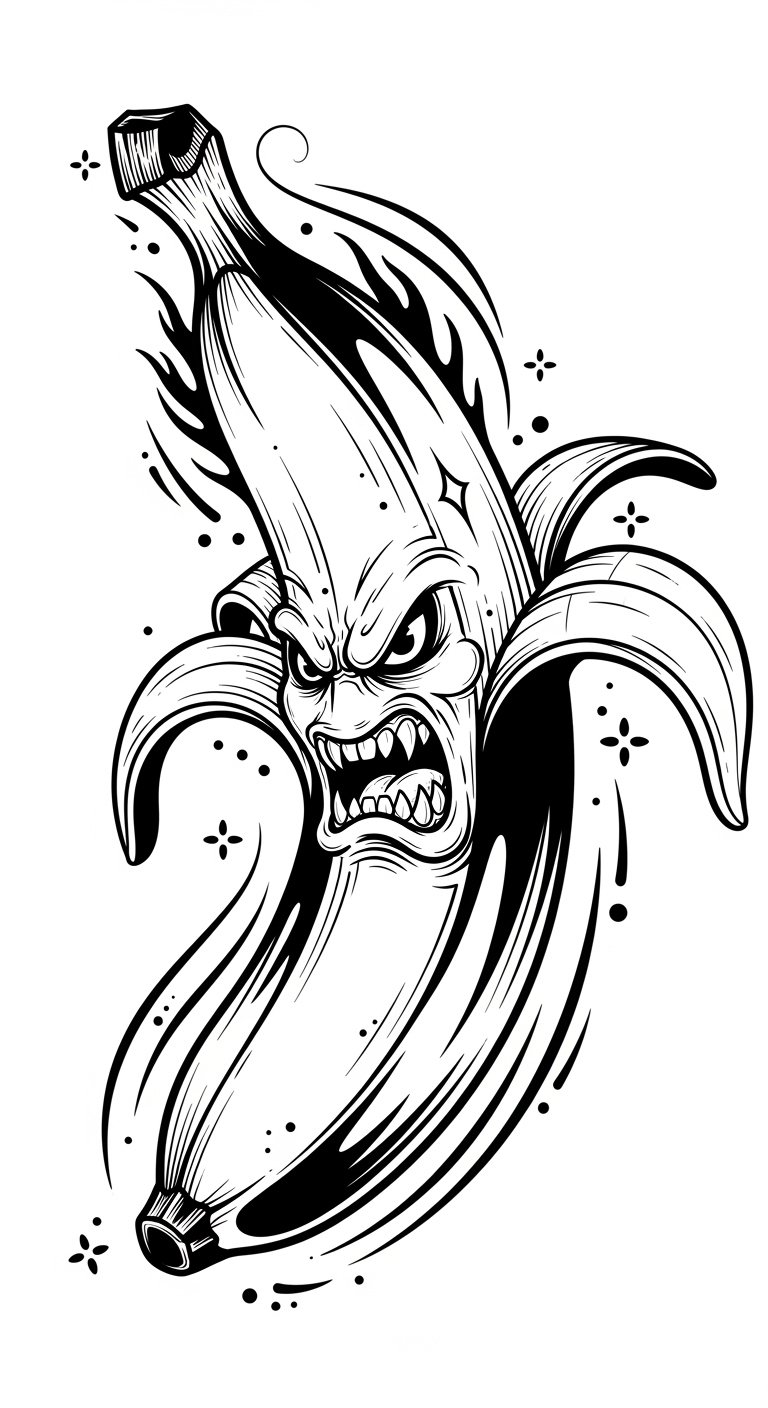 The fierce banana symbolizes playful rebellion and unapologetic individuality; its bold lines and surrounding ornamental strokes convey strength, freedom, and the layered stories each stroke carries.