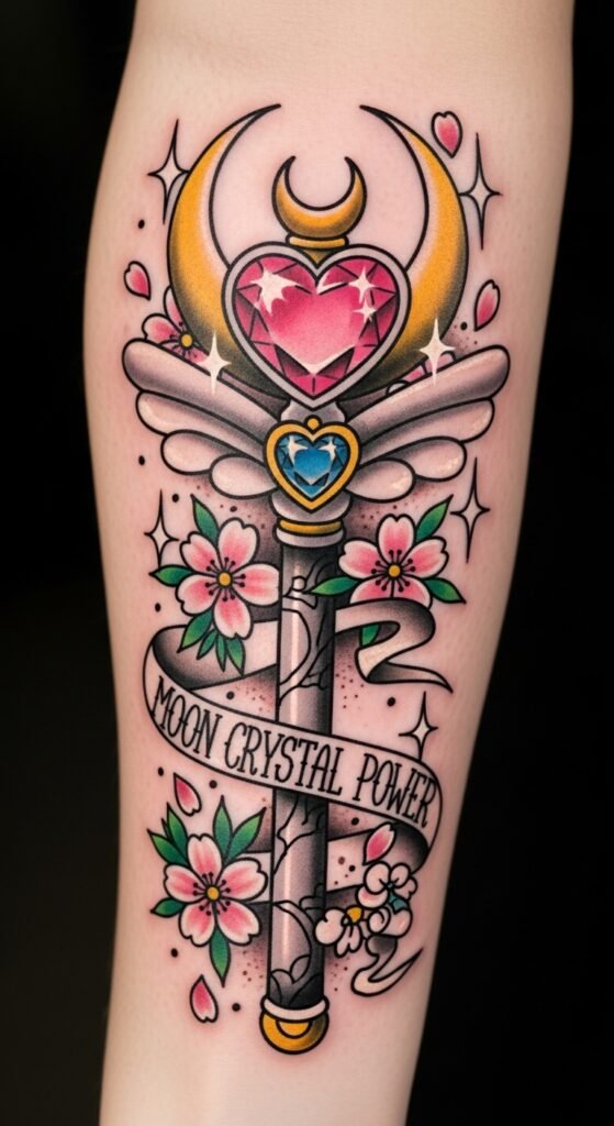 Just like the original inspiration, this tattoo design symbolizes empowerment, friendship, and nostalgia; the crescent moon and jewel represent inner strength and a guiding light, while ribbons and stars evoke connection and playful whimsy.