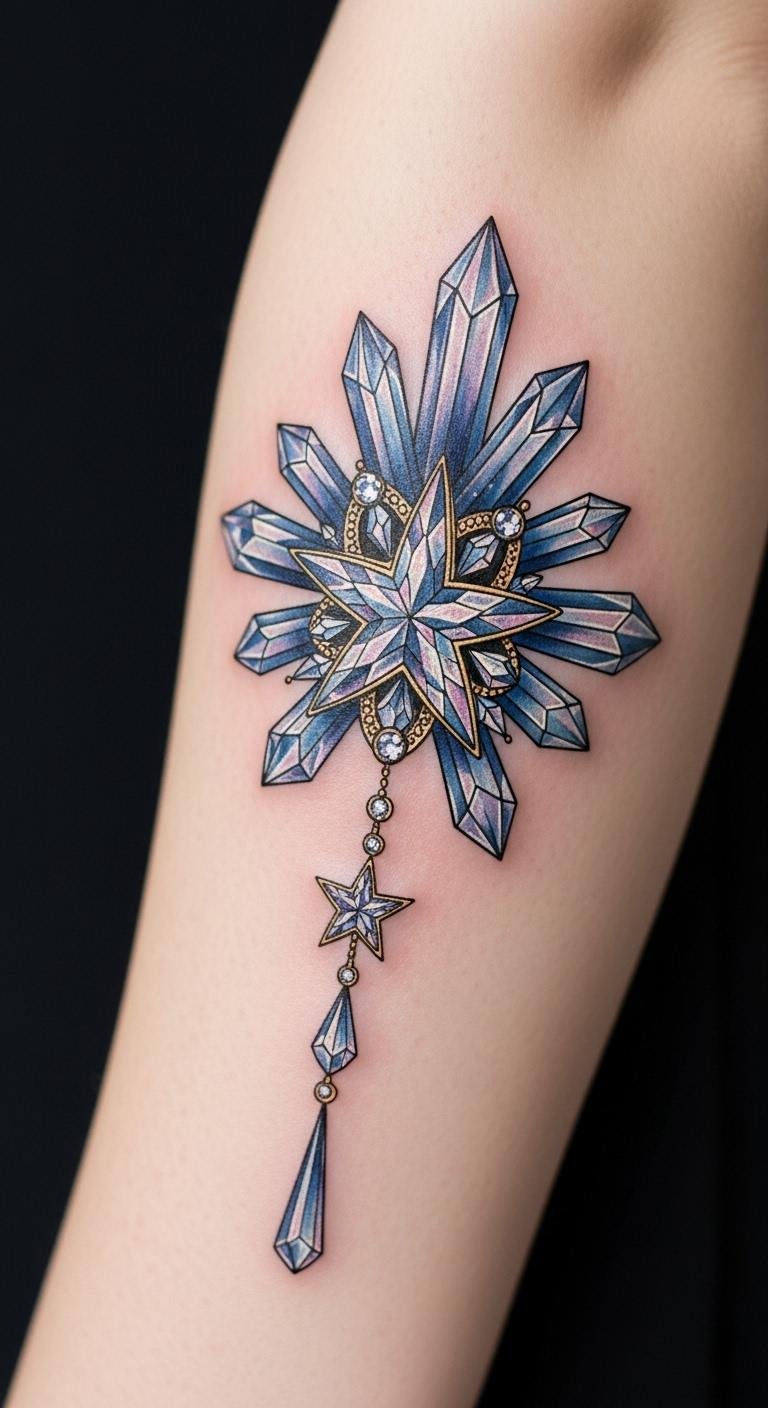 Best placed on the upper back between the shoulder blades, the inner forearm, or over the heart for personal meaning; scale and color can be adjusted to read as delicate jewelry or bold emblem depending on desired visibility.