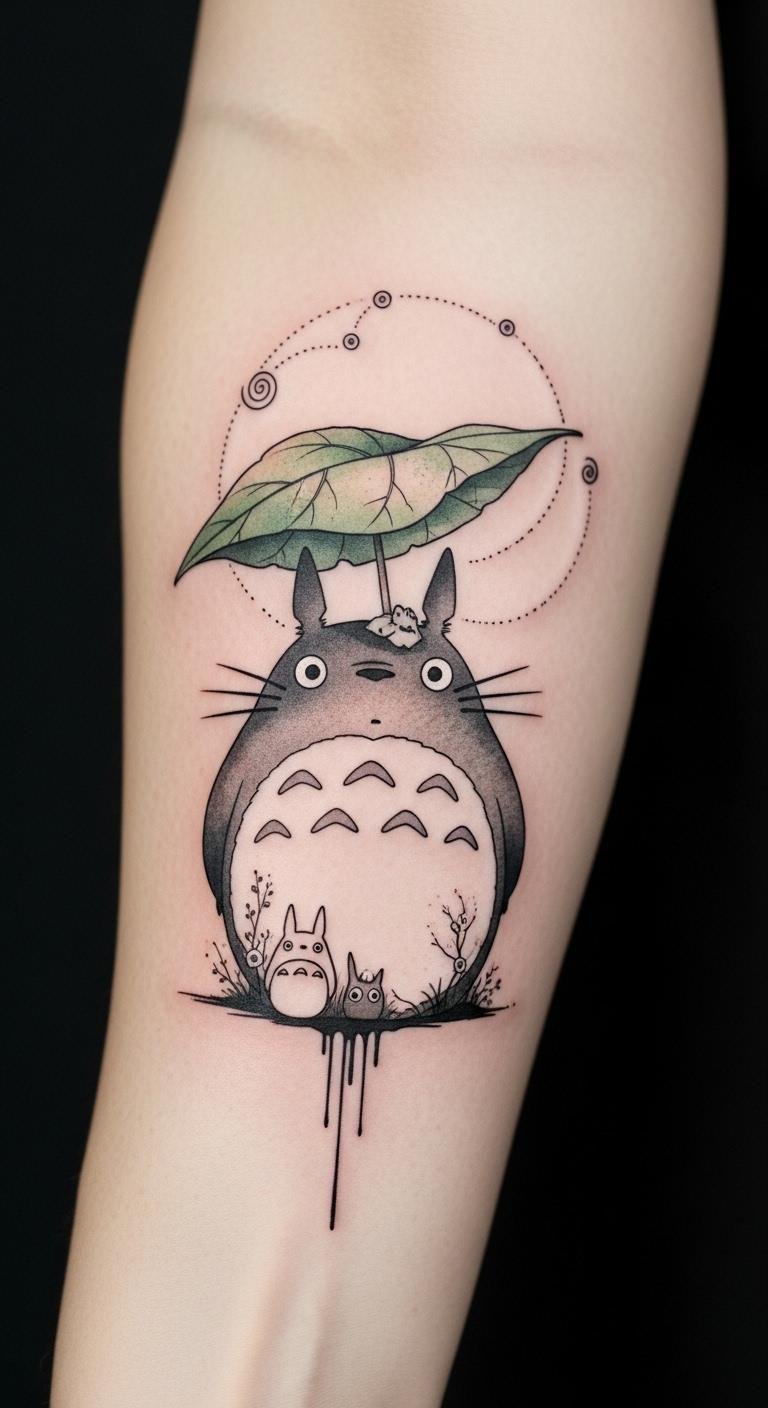 Whether you opt for a bold design or something minimalist, it’s a celebration of freedom and creativity in art. This concept blends nostalgia and gentle whimsy: the Totoro silhouette conveys comfort and guardianship, the leaf umbrella symbolizes shelter and resilience, and the soot sprites add playful mystery.