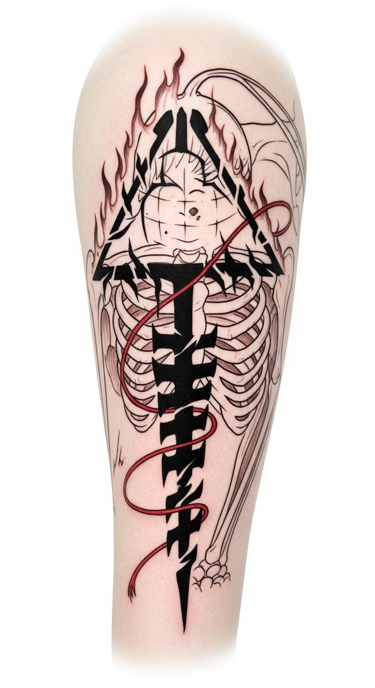 This tattoo embodies scar symbolism, connecting you to the characters’ struggles and resilience. It reflects your alchemical heritage, reminding you of the transformative power of pain and sacrifice.