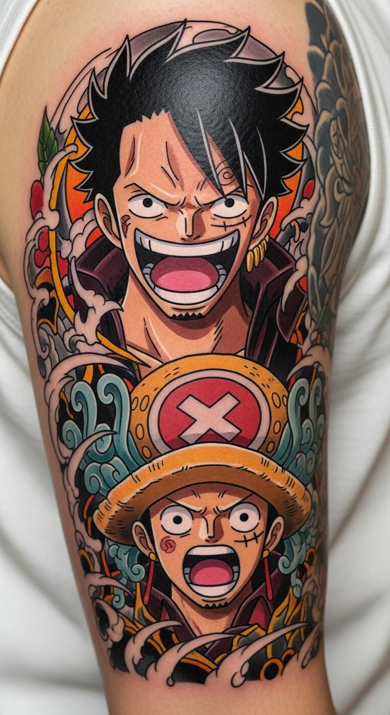 Placed along the upper arm or wrapping the shoulder blade, this design uses bold linework and saturated inks to amplify the character’s iconic posture and exaggerated expression, evoking daring adventure and playful defiance; the Devil Fruit motif integrates swirling patterns and contrasting color blocks to symbolize hidden power and personal transformation, while the dynamic movement of hair and clothing creates emotional energy—ideal for someone who wants a visible statement of fandom, resilience, and individuality.