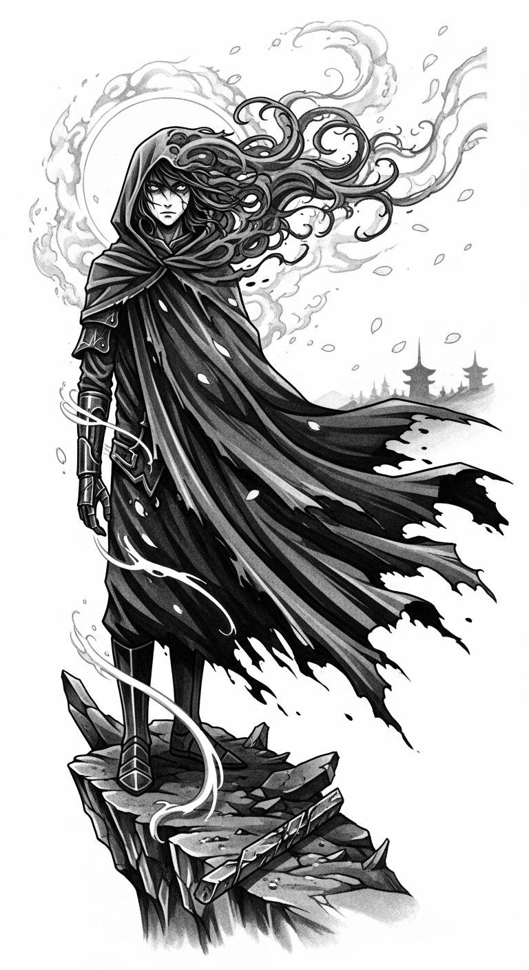 This design symbolizes solitude, resilience, and the quiet strength of a wanderer—the hooded figure represents personal journeys and protection, the windswept cloak and ink-clouds convey emotional turbulence, while the sakura petals and temple silhouettes hint at fleeting beauty and inner peace.