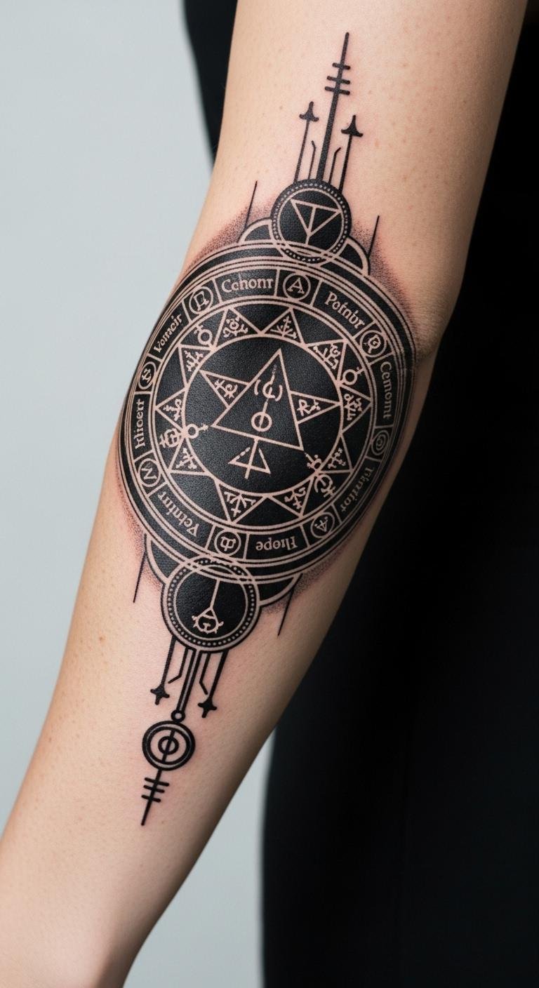 Crafted from intricate alchemical symbols, the Fullmetal Alchemist Transmutation Circle tattoo evokes transformation, scientific curiosity, and the weight of sacrifice; the dense lines and geometric symmetry draw the eye and suggest controlled power, while the open spaces represent freedom and personal growth.