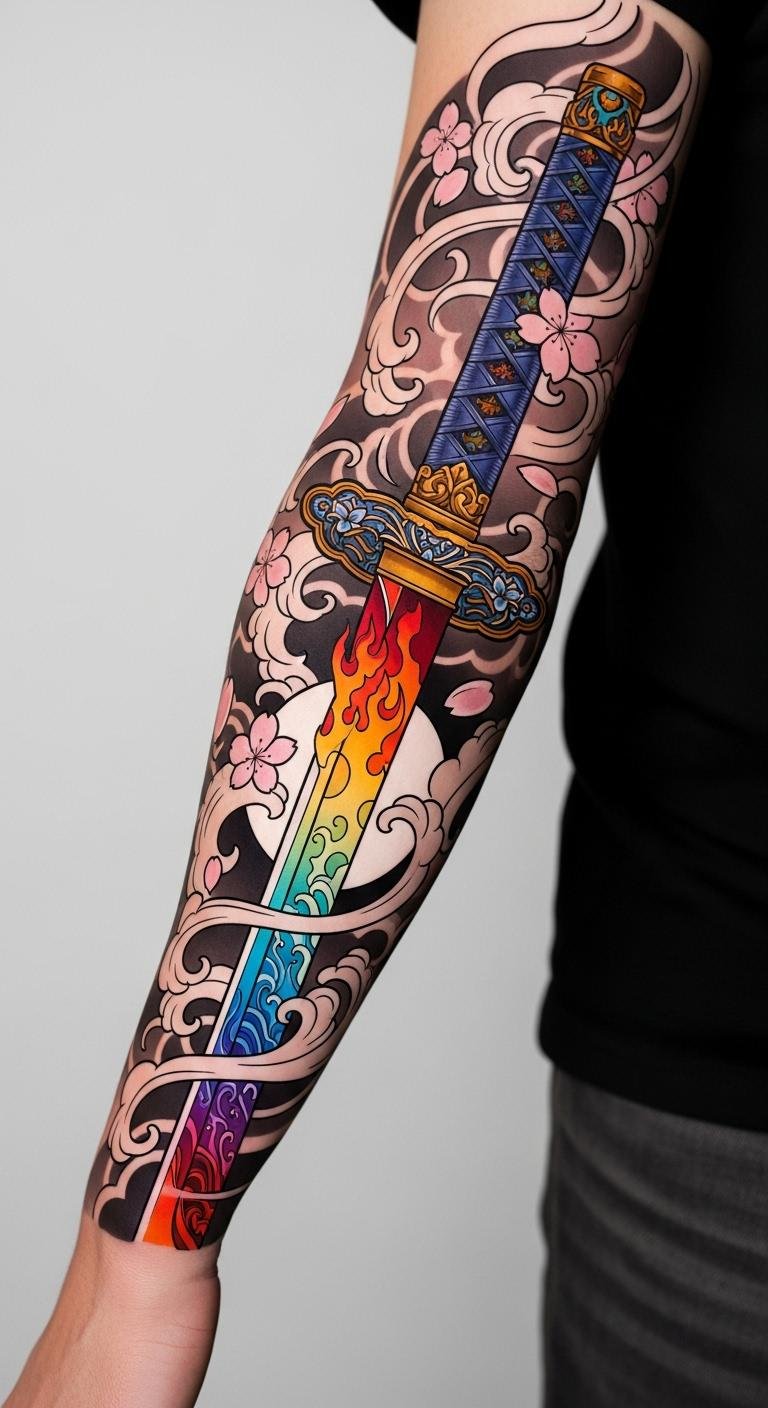 The vibrant Demon Slayer sword tattoo captures the essence of the anime’s fierce battles and the unwavering spirit of its heroes.