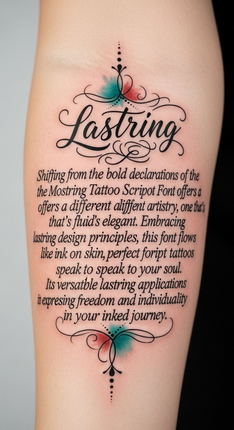 Embracing lastring design principles, this font flows like ink on skin, perfect for script tattoos that speak to your soul. Its versatile lastring font applications make it ideal for expressing freedom and individuality in your inked journey.