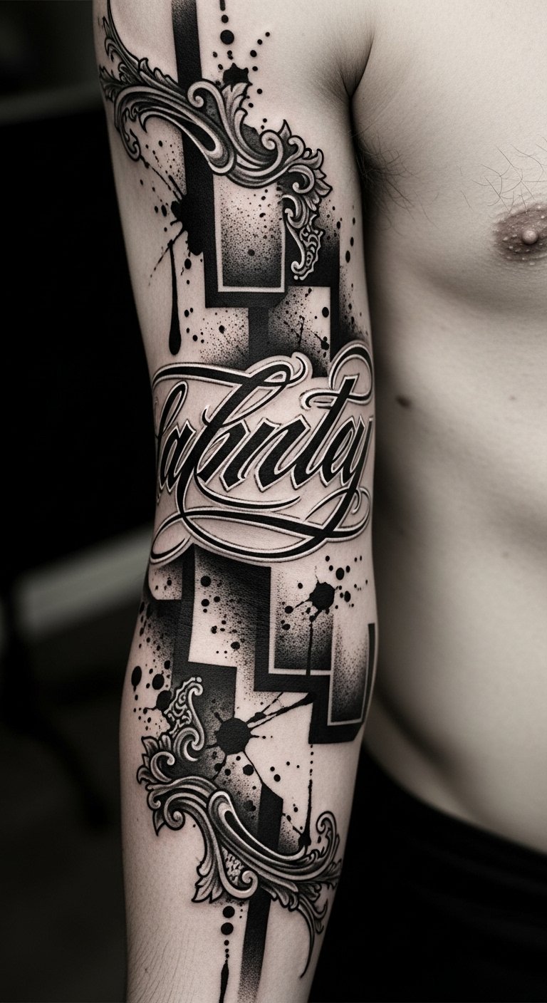 Embrace these lettering techniques to elevate your ink aesthetics! The design symbolizes confidence and creative force, the heavy strokes as visual anchors for personal identity while the ink splatters and geometric blocks represent spontaneity and structure in balance; emotionally it reads as bold, unapologetic self-expression.