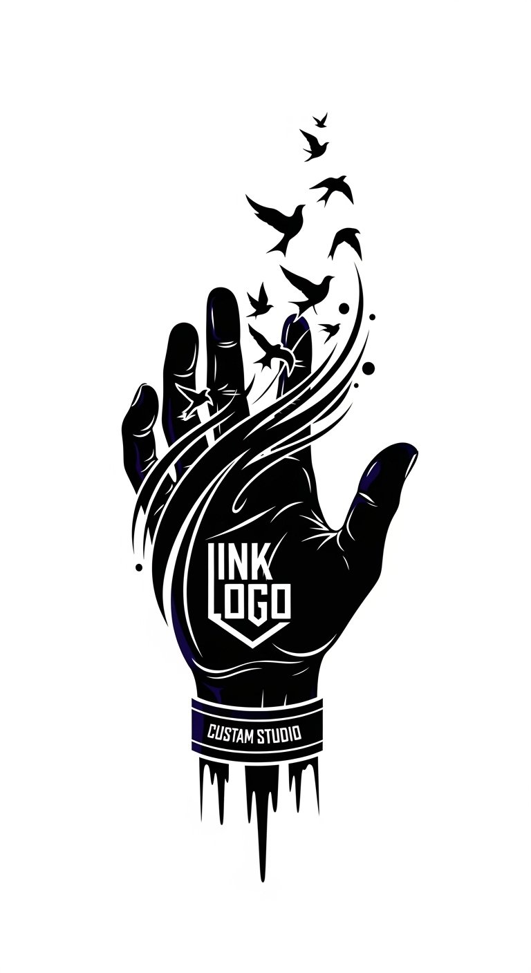 The open hand symbolizes the studio’s role as a creative conduit, releasing clients’ stories as birds that transform into flowing ink—representing transition from idea to permanent art;