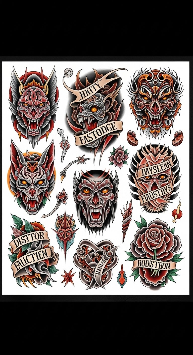 This concept combines classic flash composition with modern edge: bold linework, saturated colors, and mixed textures to evoke rebellion and narrative depth. Symbolically, elements like fractured roses, anchored daggers, and winding banners represent resilience, purpose, and personal slogans; dynamic placement options include forearm panels for visible storytelling, shoulder pieces for larger compositions, or ribcage placements for a more intimate effect. The emotional tone ranges from defiant to reflective, inviting the wearer to assert identity while carrying layers of personal meaning.