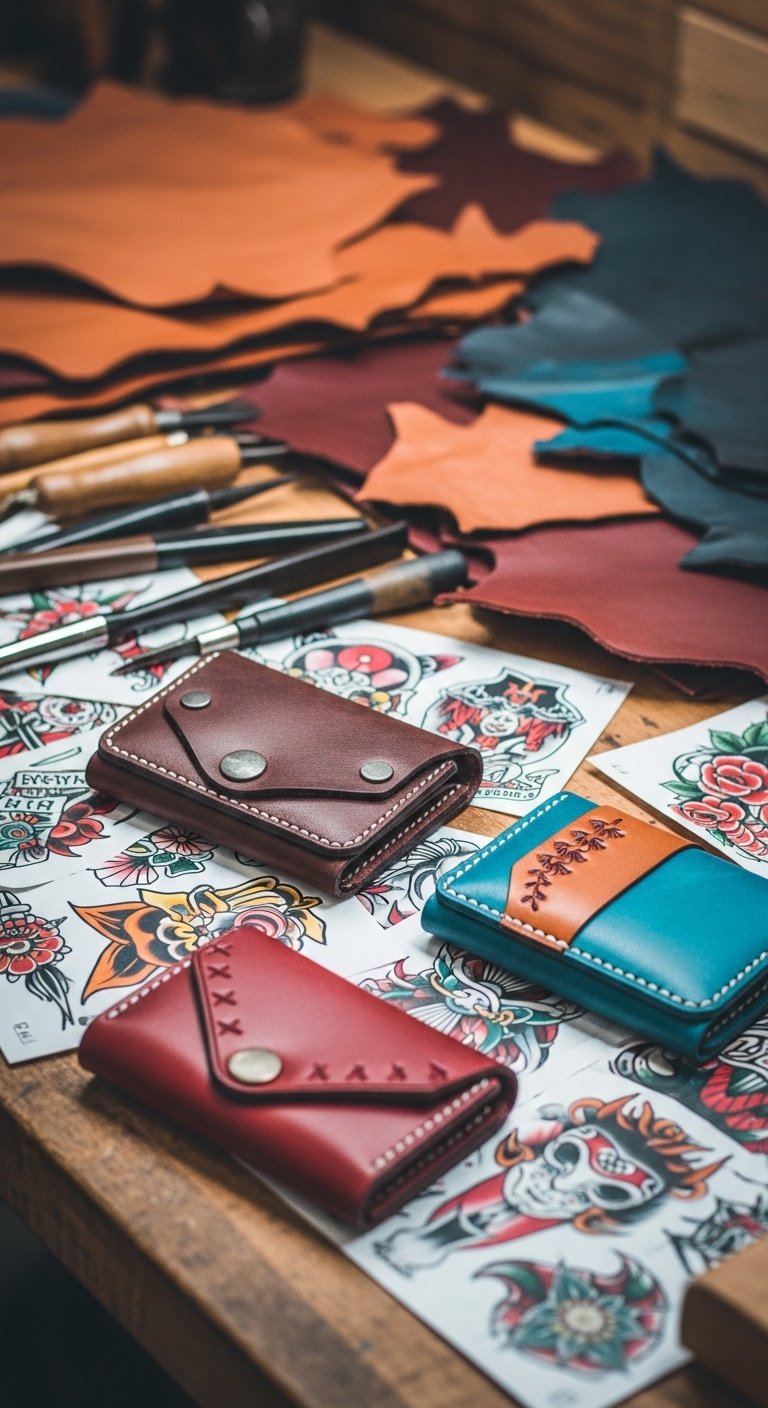 Emotionally it blends pride in handmade work with gentle nostalgia, ideal for forearm or upper back placement where elongated tooling patterns and stitched edges can flow with muscle lines, allowing both visible statement and intimate connection to the wearer’s values.