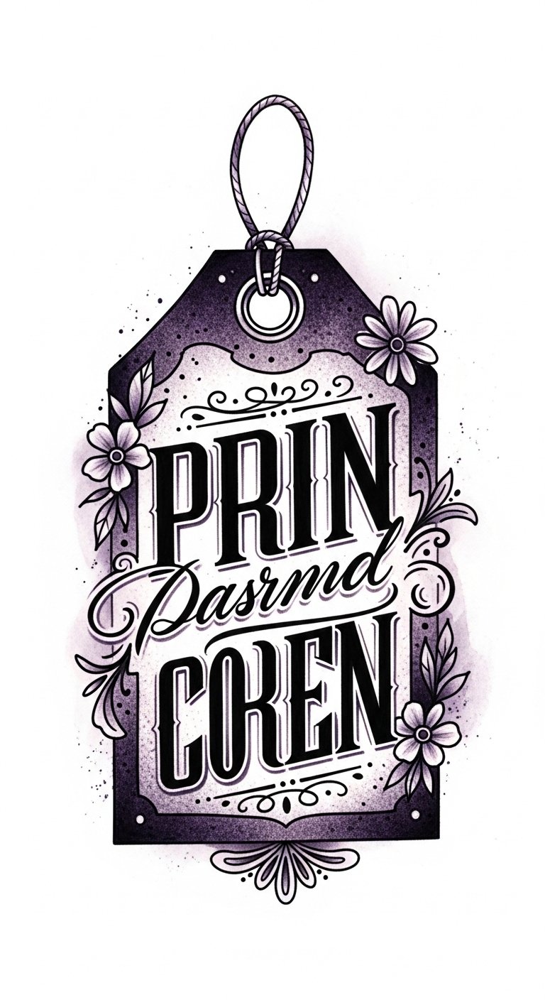 The hangtag as a tattoo symbolizes identity and crafted presentation—bold typography reflects confidence, decorative elements convey artistry, and the looped string suggests connection to personal stories.