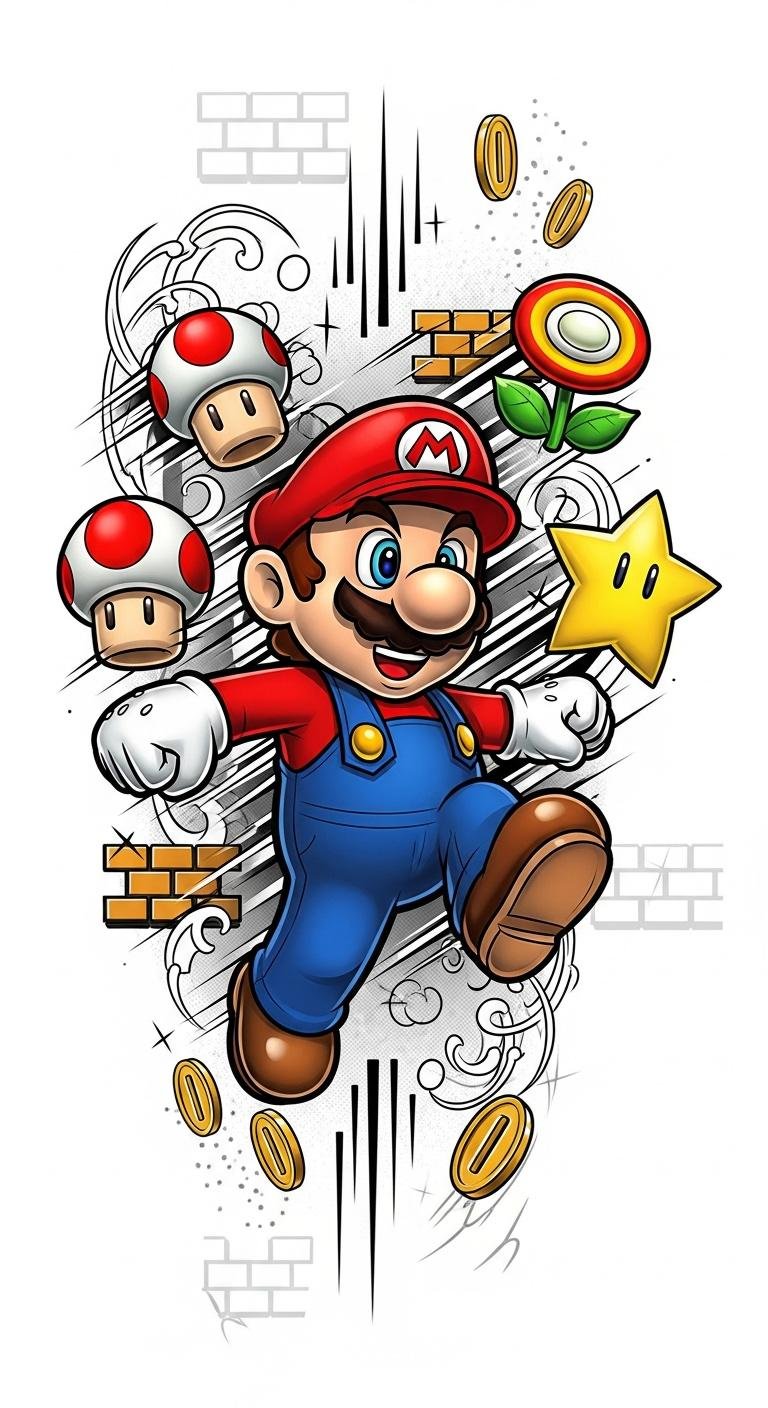 Wearing one of these pieces celebrates your passion for Mario’s enchanting universe! This sleeve concept symbolizes nostalgia, friendship, and triumph—each character and power-up representing resilience, joy, and playful perseverance.