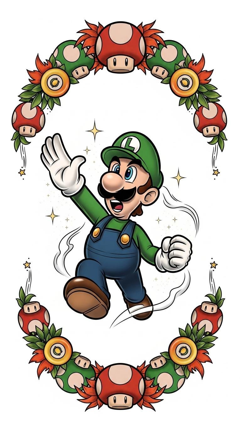 The design uses recognizable elements—the crescent of Super Mushrooms and Fire Flowers—to symbolize growth, power, and warmth; Luigi’s upward, slightly off-center stance conveys perseverance and quiet courage.