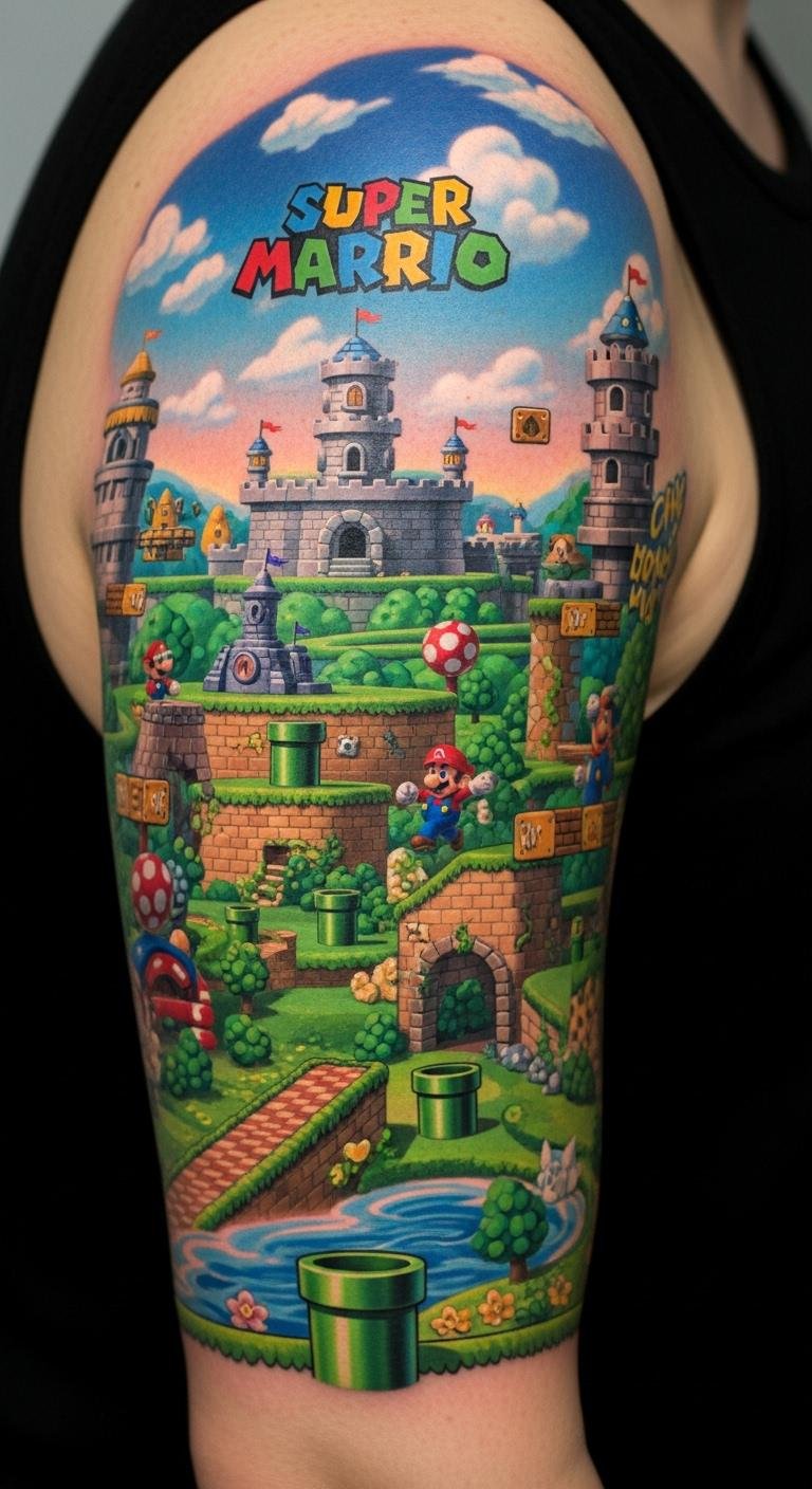 A sleeve or back piece that layers winding pipes, distant castles, floating platforms, and subtle power-up motifs to mirror the original text’s immersive landscapes; the composition symbolizes a personal journey—pipes as choices, castles as goals, platforms as challenges—evoking nostalgia, wonder, and playfulness.