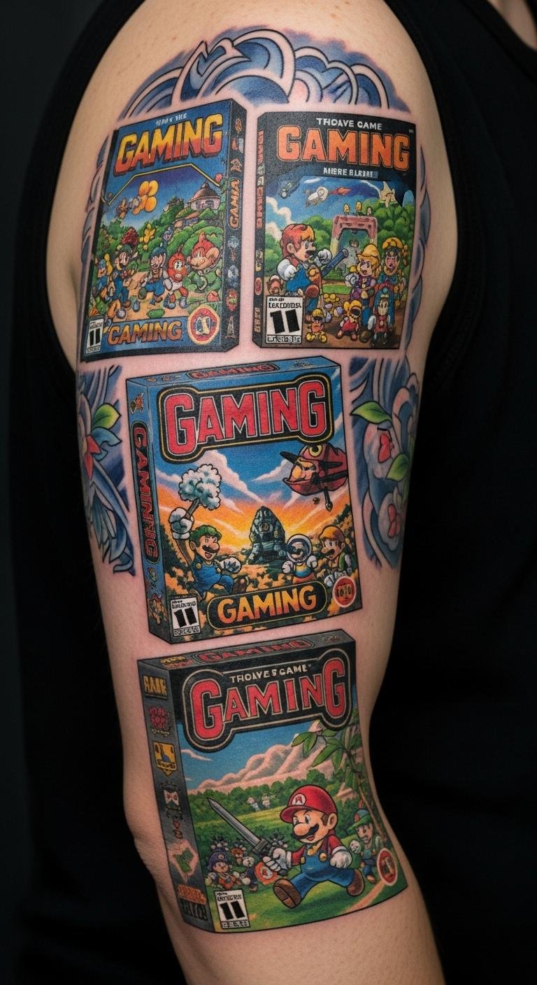This tattoo concept uses bold, saturated colors and layered panels to mimic classic box-art composition: a central scene of a heroic pixelated protagonist framed by smaller vignettes of memorable game motifs (cartridges, controllers, score counters). Symbolically it blends personal memory and shared cultural icons—each vignette representing a specific era or favorite title to evoke joy and nostalgia. Emotionally it aims for warmth and playful pride; ideal placements are the upper arm or chest where the rectangular composition can read like a miniature poster and be expanded with additional panels over time.