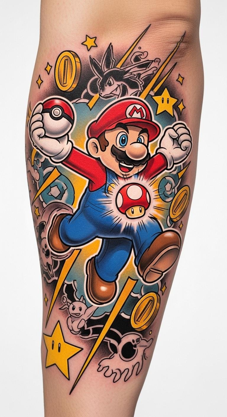 When it comes to classic character tattoos, Mario in action takes center stage, embodying the spirit of adventure and fun that fans adore.