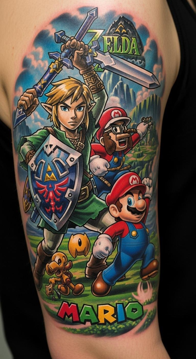 These tattoos burst with colorful palettes and vibrant aesthetics, reflecting the joyful game vibes you adore. Each artistic interpretation showcases beloved characters and iconic symbols, bringing your favorite moments to life.