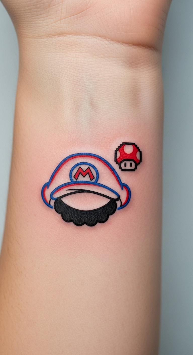 Whether it’s a single mushroom or a simple outline of his iconic hat, these tattoos celebrate your passion for gaming in an elegant, understated way. The hat and mustache form the emotional anchor—nostalgia, courage, and playfulness—while the tiny mushroom adds growth and power-up symbolism.