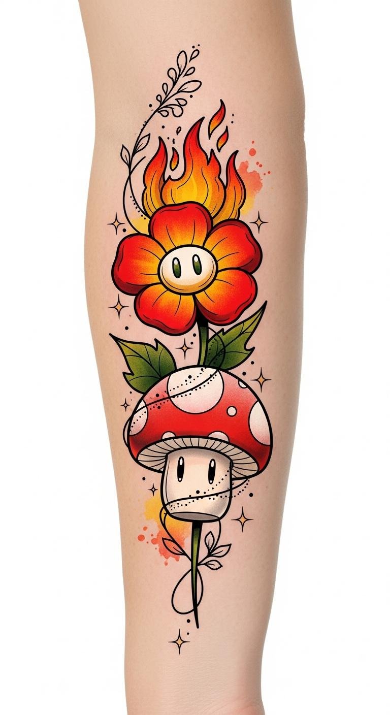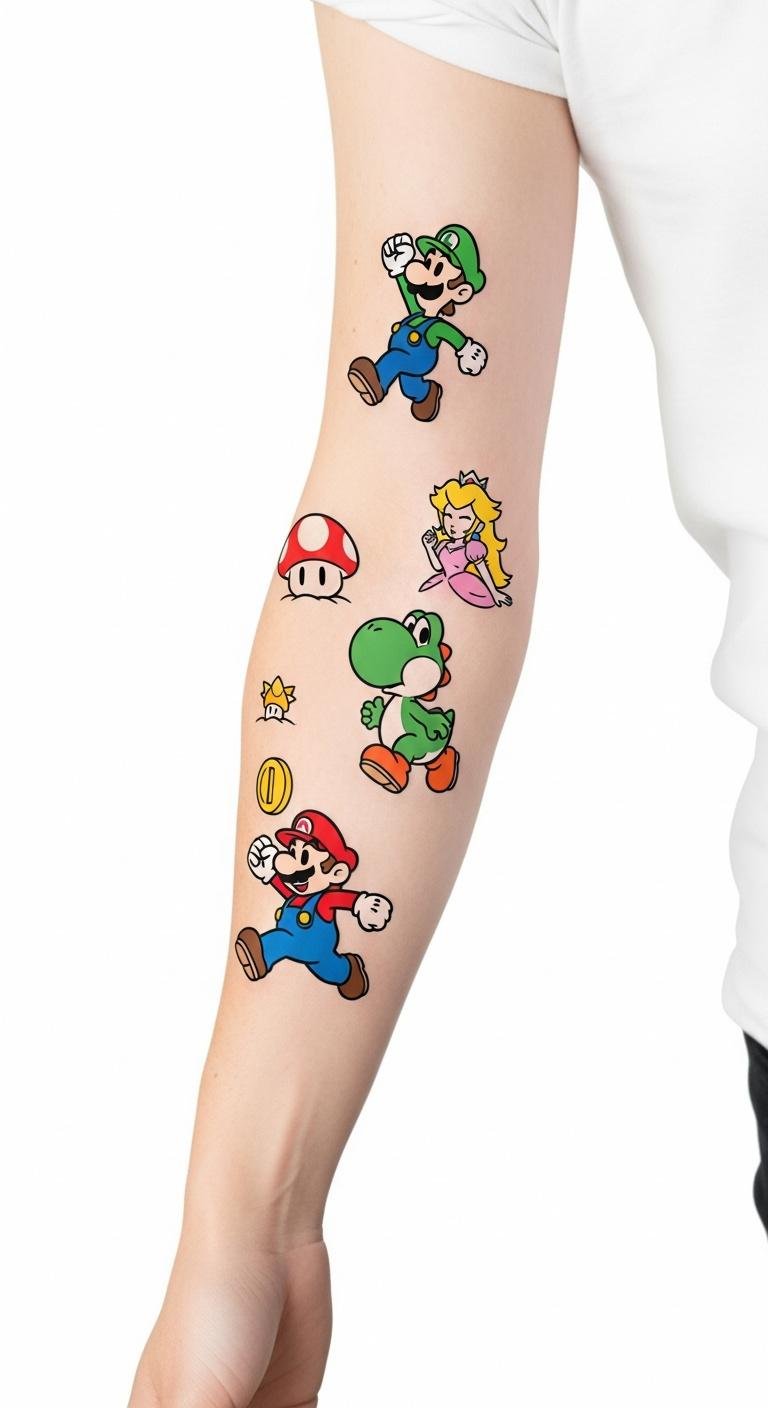 Imagine vibrant designs capturing iconic poses, showcasing Mario power-ups and classic game elements. Each tattoo tells a story of character evolution, celebrating the Mario fandom.