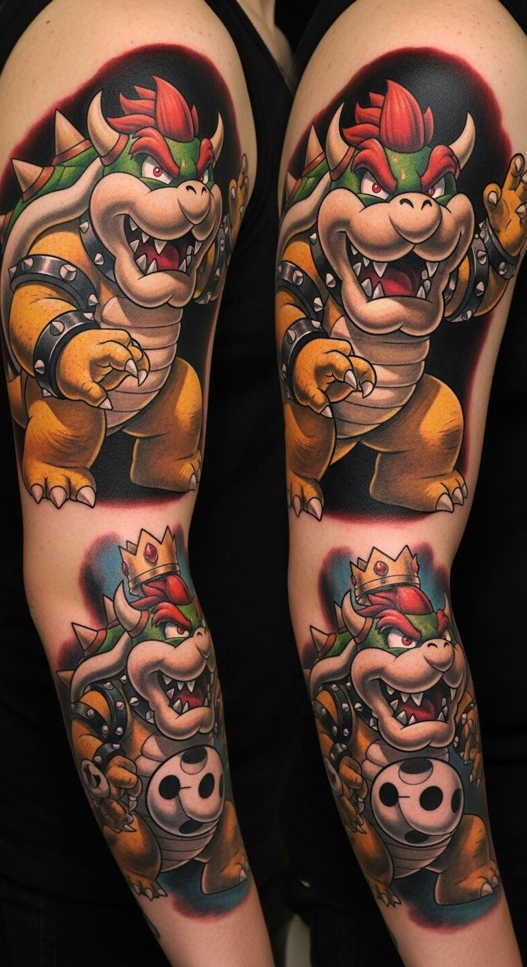 Bowser’s snarling visage and spiked shell convey dominance and defiance, ideal for a bold upper-arm, chest, or back piece where scale and detail emphasize his royal menace; the design can blend sharp linework, textured shading, and splashes of molten color to evoke battle-worn strength and an enduring adversarial bond, invoking nostalgia, rebellion, and pride for fans who wear the legacy of the Koopas as both a statement of power and a tribute to classic gaming conflict.