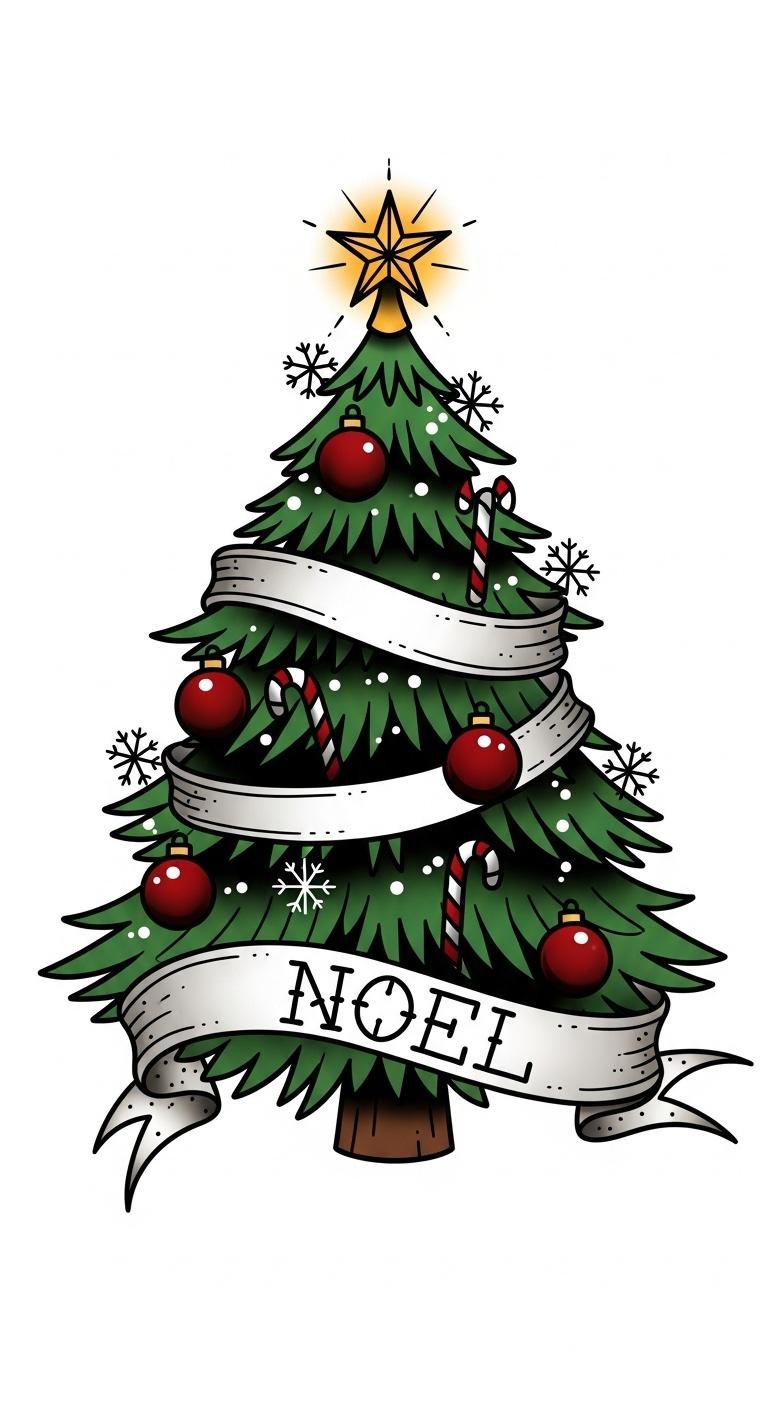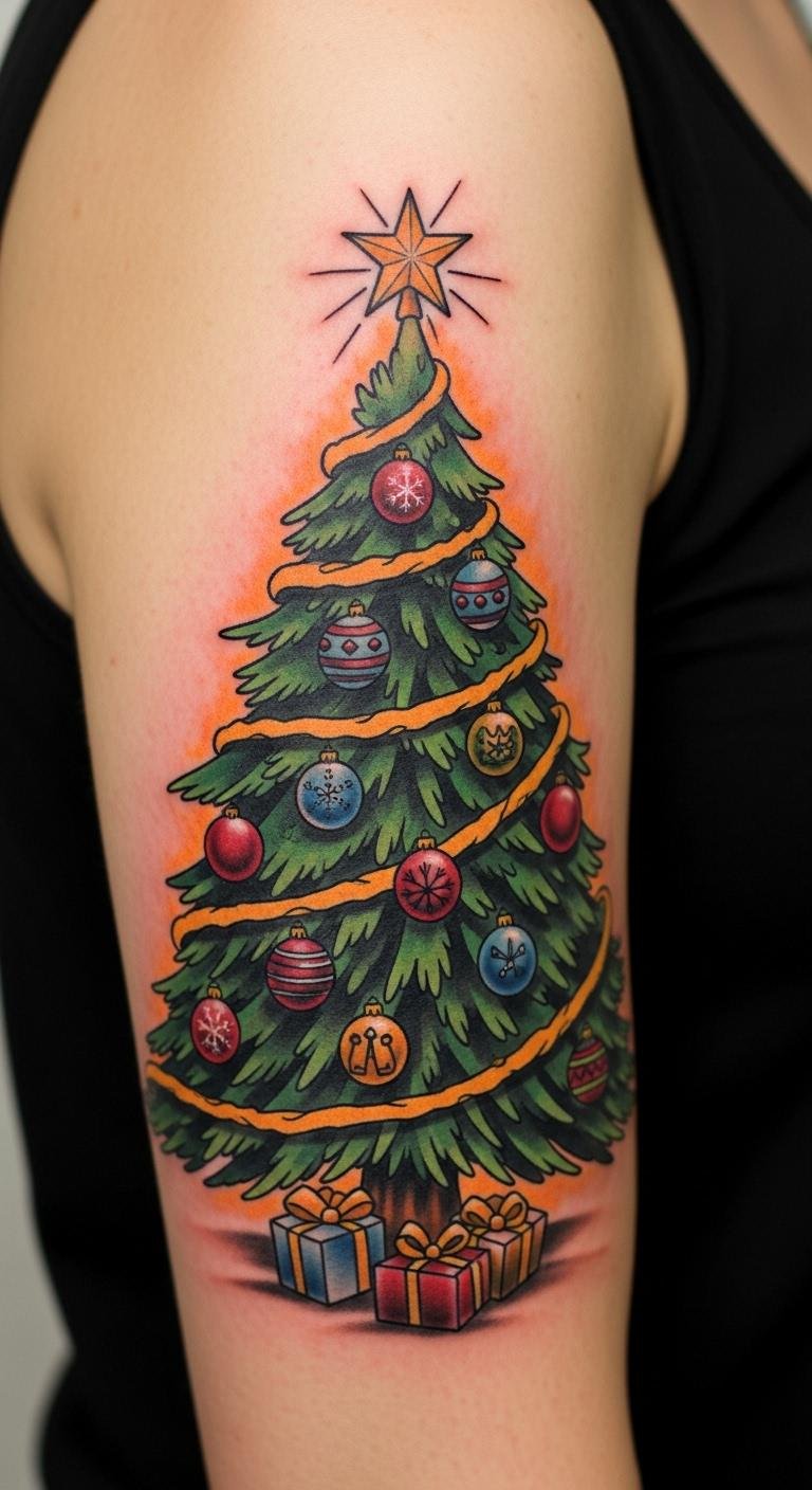 Traditional style Christmas tree tattoos capture the essence of holiday nostalgia with their bold lines and vibrant colors. These designs embrace traditional tattoo symbolism, celebrating joy and togetherness during the festive season.