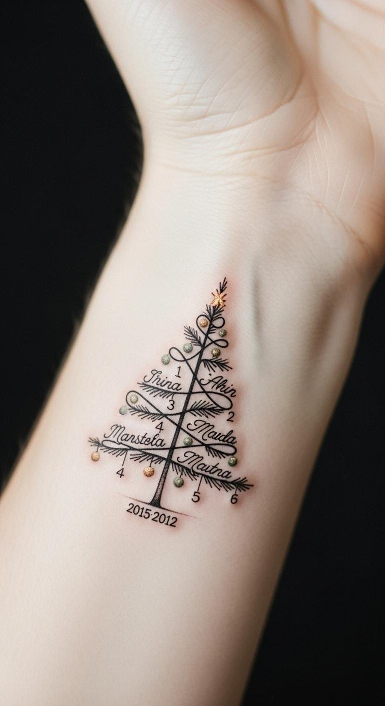 Mini Christmas tree tattoos can beautifully serve as the canvas for personalization, especially when you add names and dates that hold special meaning.