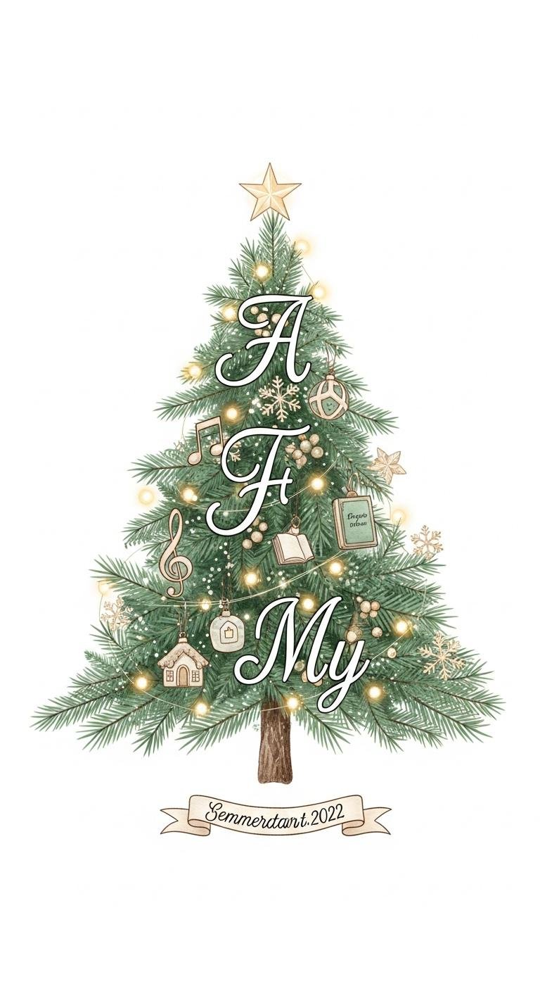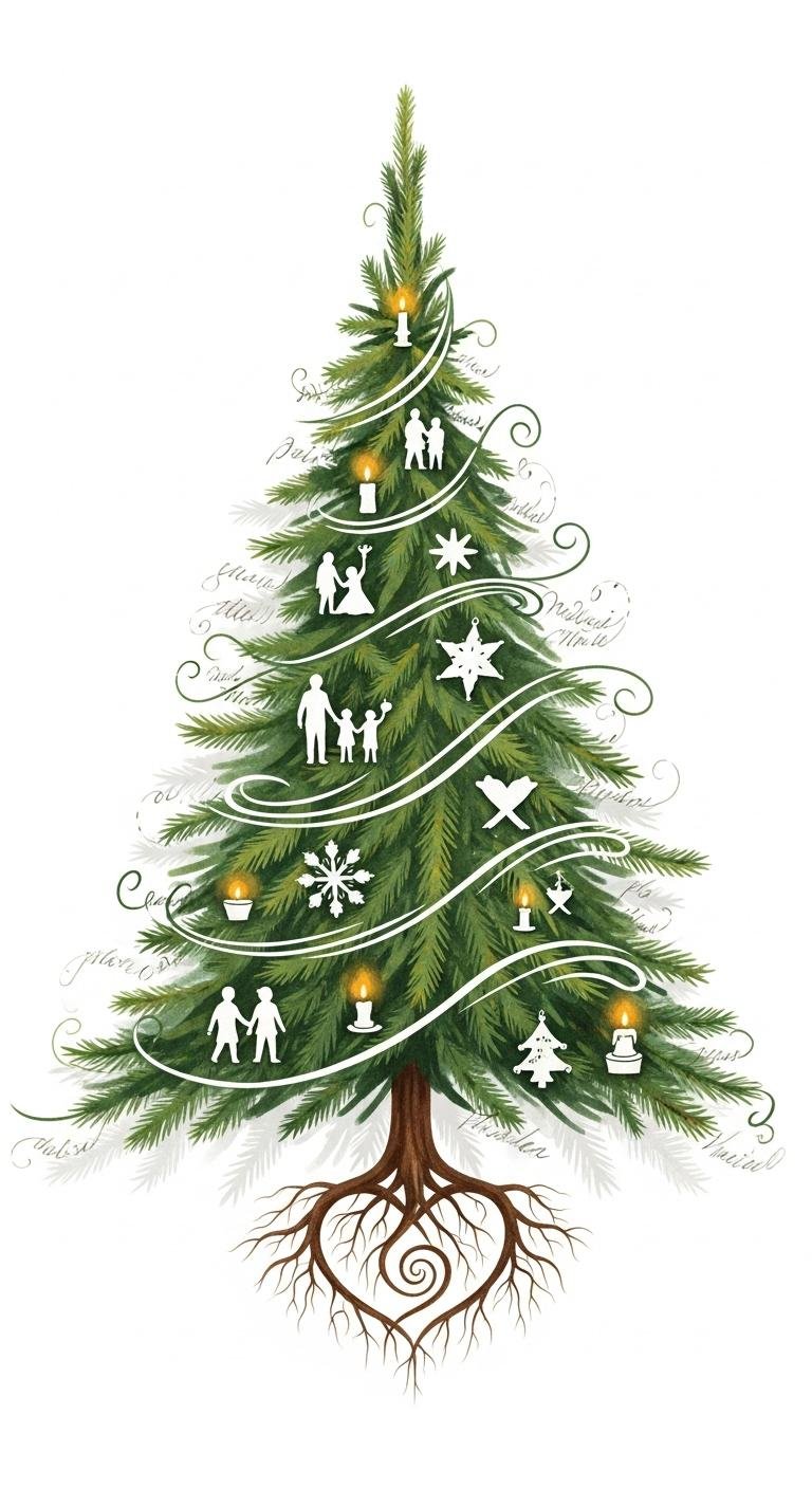 This concept symbolizes the convergence of tradition and personal narrative: a stylized evergreen rendered with a mix of clean minimalist lines and splashes of watercolor, small ornaments replaced by tiny personal motifs (initials, dates, or small icons) woven into the branches; it evokes warmth, memory, and celebration while allowing for individual storytelling.
