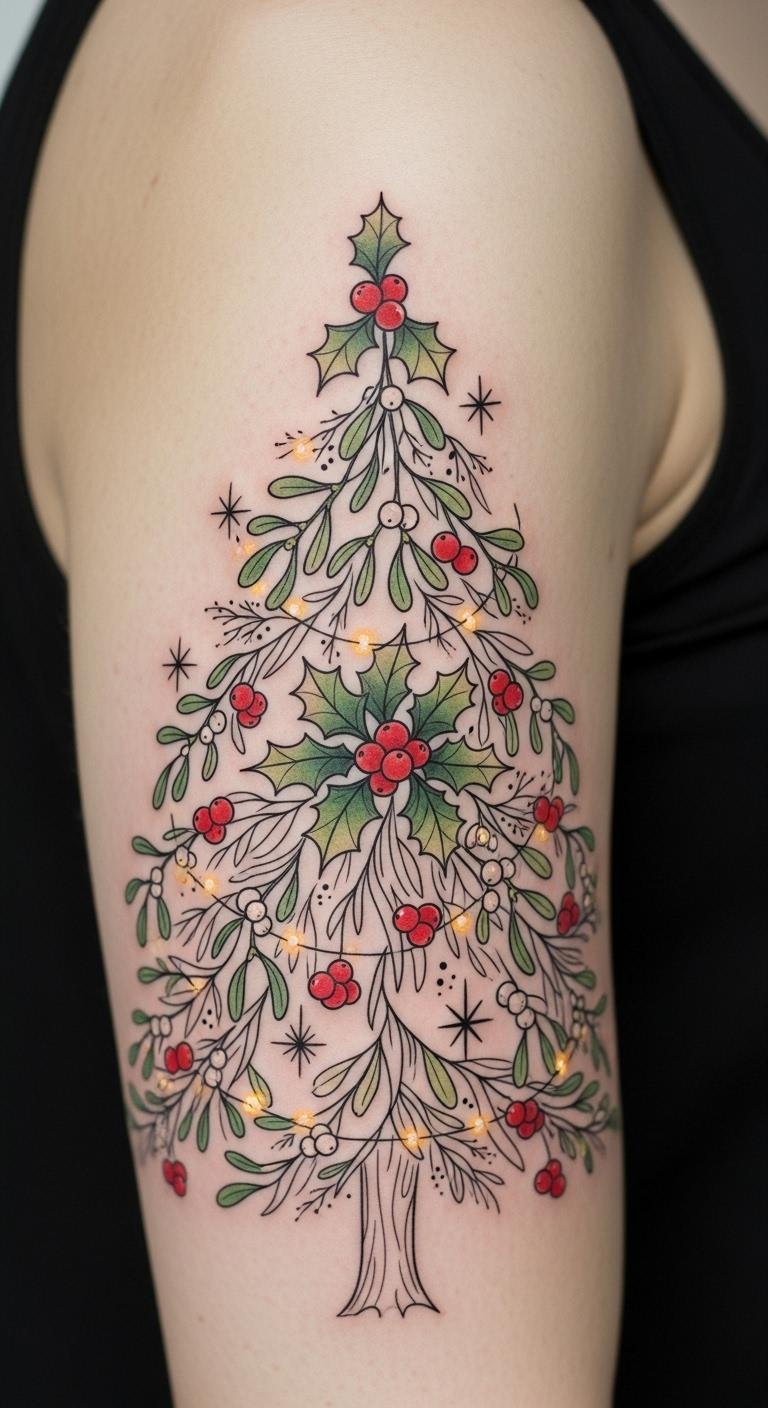 Christmas Tree Tattoos With Holly and Mistletoe