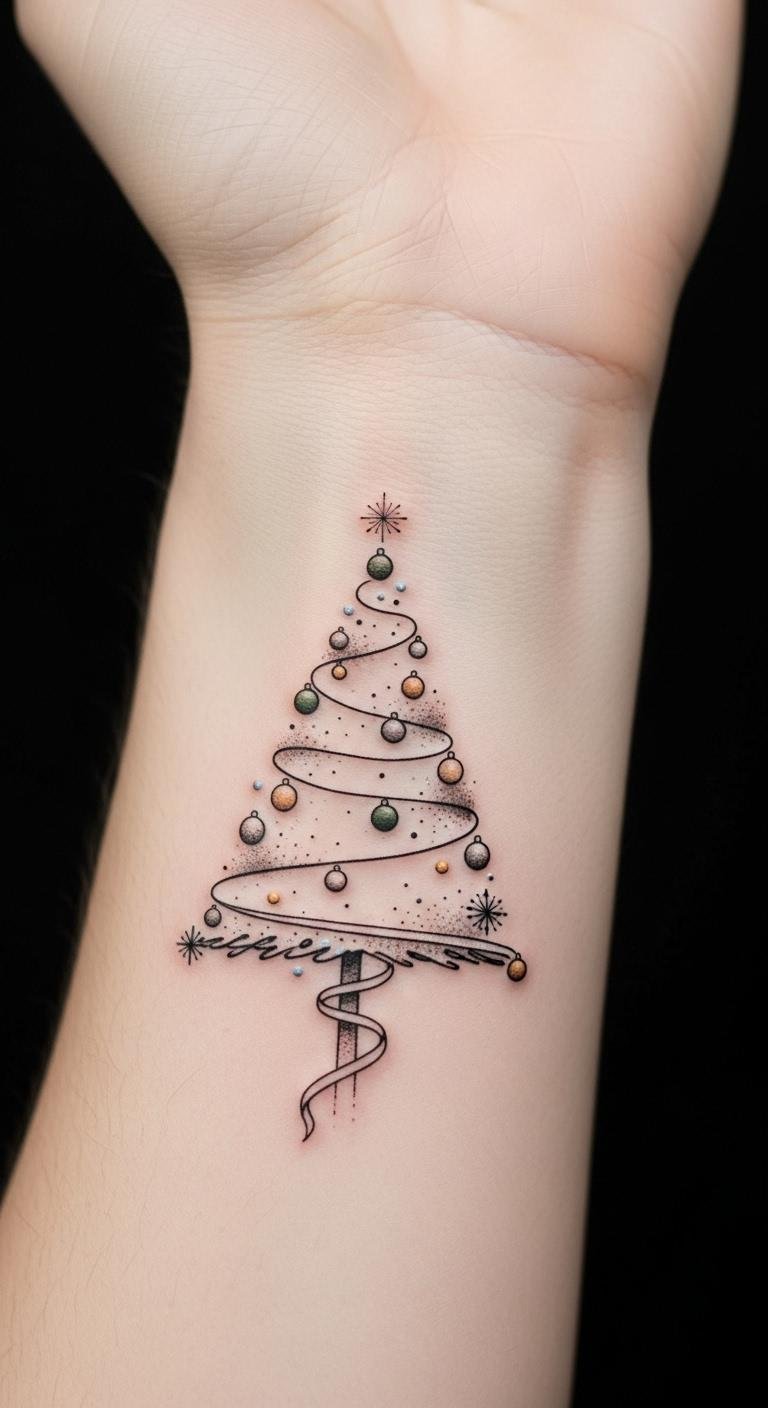 This design symbolizes continuity and intimacy—the tree as a focal point for family and memory, the ribbon as connection, and the snowflakes as fleeting moments preserved; it evokes gentle nostalgia and everyday comfort, best placed on the inner wrist or forearm where it can be seen and touched, offering a discreet but constant reminder of festive warmth.